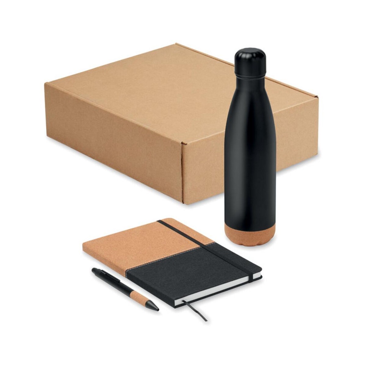 3-częściowy zestaw upominkowy CADEAU to przemyślany, elegancki komplet, który podniesie prestiż każdej kampanii promocyjnej. W solidnym pudełku o wymiarach 28 × 23,5 × 7,8 cm oraz wadze zaledwie 0,940 kg znajdziesz izolowaną butelkę ze stali nierdzewnej o pojemności 500 ml, notatnik A5 z twardą okładką wykonaną z RPET i korka – aż 160 stron w linie – oraz minimalistyczny, a zarazem wytrzymały aluminiowy długopis. Całość posiada prestiżowy certyfikat FSC®, dzięki czemu zyskujesz pewność ekologicznego pochodzenia surowców 🌿.