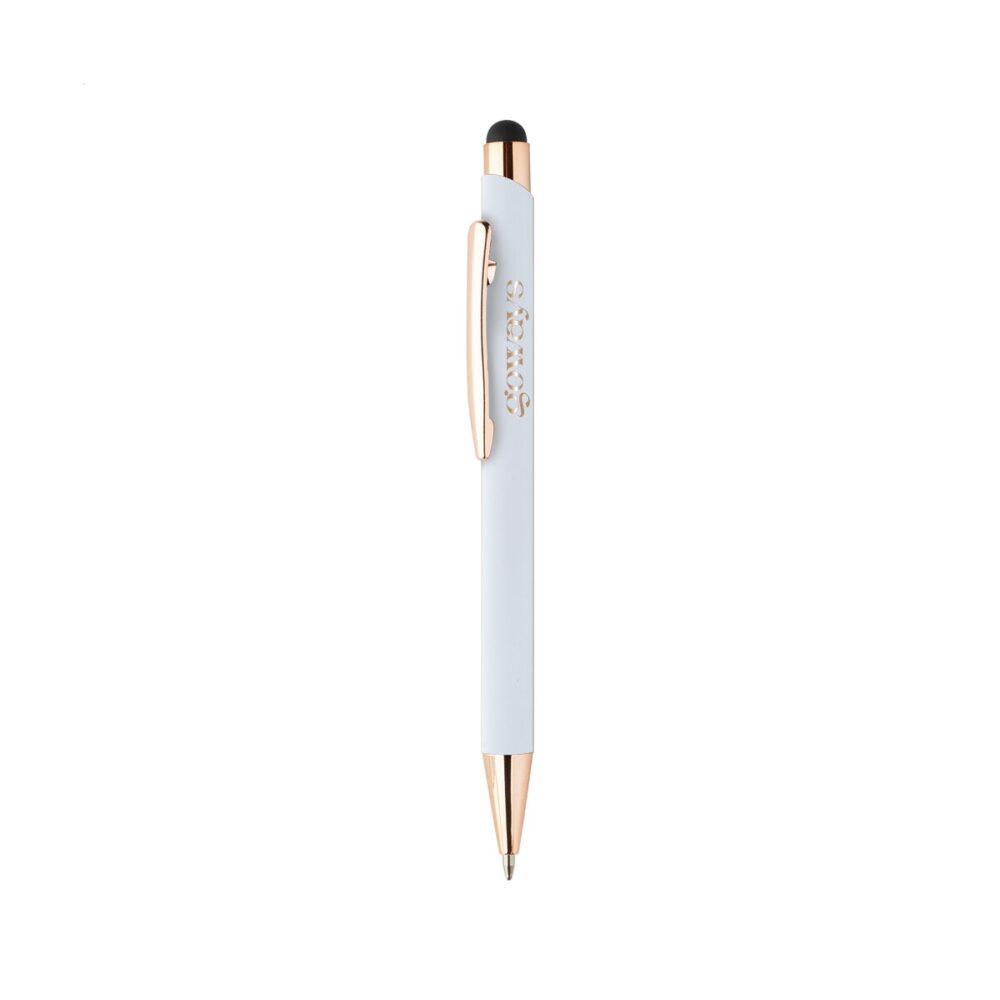 Auros długopis to prawdziwe arcydzieło wśród metalowych przyborów piśmienniczych – wykonany z aluminium pochodzącego z recyklingu, z eleganckimi elementami w ekskluzywnym kolorze różowego złota i końcówką do ekranów dotykowych pokrytą przyjemną w dotyku gumą. Dzięki specjalnej powłoce umożliwiającej grawer lustrzany, każdy Auros długopis podkreśli prestiż Twojej marki, tworząc trwały i efektowny nadruk, który zachwyci klientów 🙂.