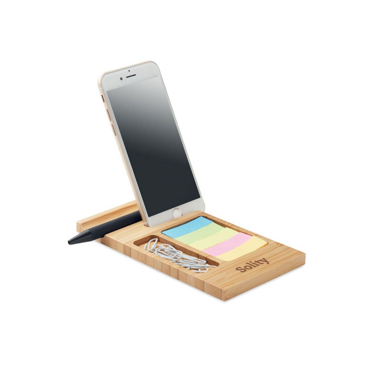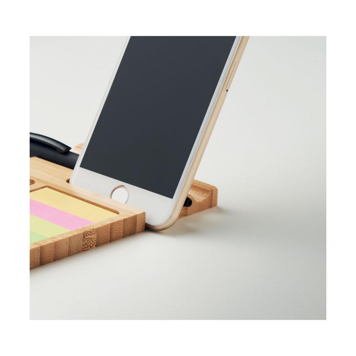 Bambusowy stojak na telefon TREVIS to sprytny i efektowny sposób na ekspozycję smartfona zarówno w biurze, jak i w domu. Wykonany z naturalnego bambusa, zachwyca unikalnym usłojeniem, dzięki czemu każdy egzemplarz jest niepowtarzalny. W zestawie znajdują się praktyczne klipsy do papieru oraz bloczek karteczek samoprzylepnych – wszystko, czego potrzebujesz, by mieć pod ręką ważne notatki i urządzenie w zasięgu wzroku 😊. Ta przemyślana konstrukcja pozwala na wygodne ustawienie telefonu w pionie lub poziomie, co ułatwia prowadzenie wideorozmów, śledzenie powiadomień czy oglądanie filmów bez konieczności trzymania urządzenia w dłoni.