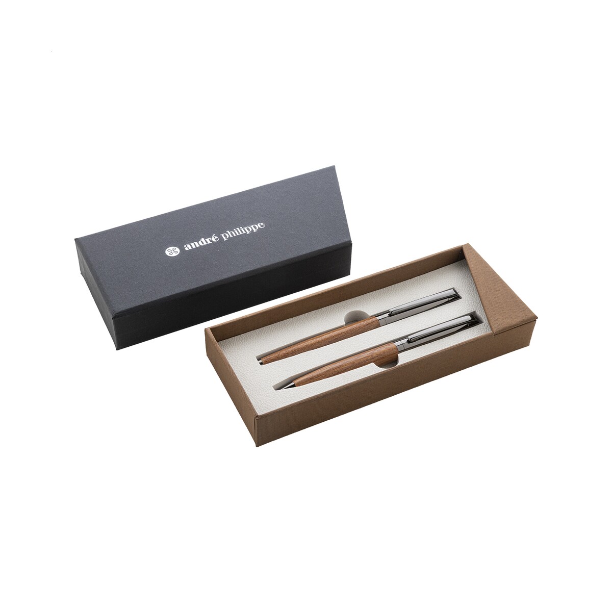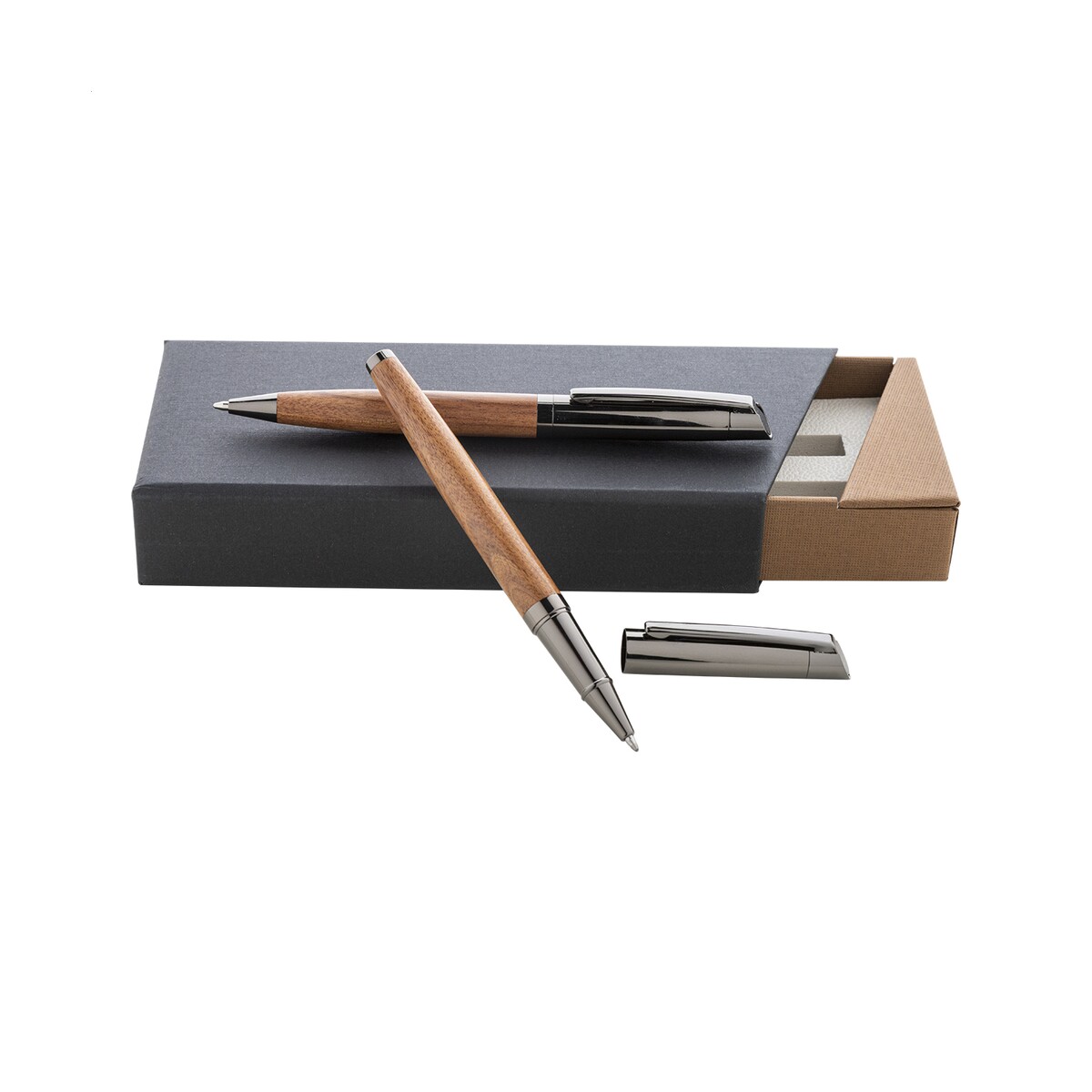 Bidarray zestaw piśmienniczy to ponadczasowa propozycja, która łączy w sobie elegancję metalu z ciepłem naturalnego drewna. Składa się z wysokiej klasy długopisu oraz pióra kulkowego, zapakowanych w efektowne, dwukolorowe pudełko prezentowe. Dzięki błyszczącym detalom i solidnemu wykonaniu z materiałów premium staje się nie tylko praktycznym narzędziem do pisania, lecz również prestiżowym gadżetem biznesowym, który znakomicie podkreśli profesjonalny wizerunek dla Twojej firmy 🙂.