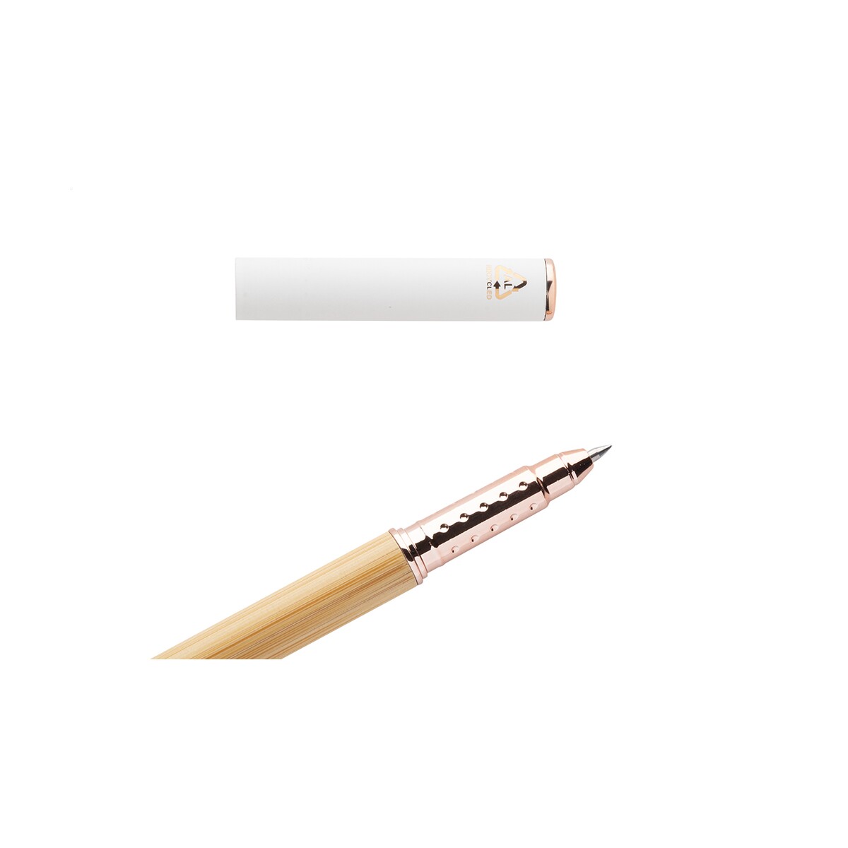 Blush pióro kulkowe to prawdziwy klejnot w kategorii długopisów bambusowych oraz metalowych z logo. Połączenie naturalnego bambusa i aluminium z recyklingu, wykończenie w szlachetnym kolorze różowego złota oraz gumowana skuwka nadają mu wyjątkowo elegancki charakter. Dzięki specjalnej powłoce przystosowanej pod grawer lustrzany w identycznym odcieniu różowego złota, każdy nadruk czy personalizacja stają się olśniewającą wizytówką dla Twojej firmy. 🙂