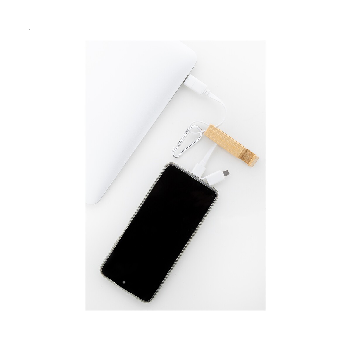 Dzięki solidnemu wykonaniu z recyklingowanego aluminium i naturalnego bambusa kabel wyróżnia się trwałością i ekologicznością. Tym samym staje się nie tylko atrakcyjnym, lecz także świadomym wyborem dla Twojej firmy, która chce pokazać troskę o planetę. To doskonały upominek dla pracowników mobilnych, studentów, uczestników targów i konferencji czy kierowców korzystających z nawigacji – każdy doceni możliwość podparcia telefonu bambusowym uchwytem i ładowania kilku urządzeń jednocześnie.
