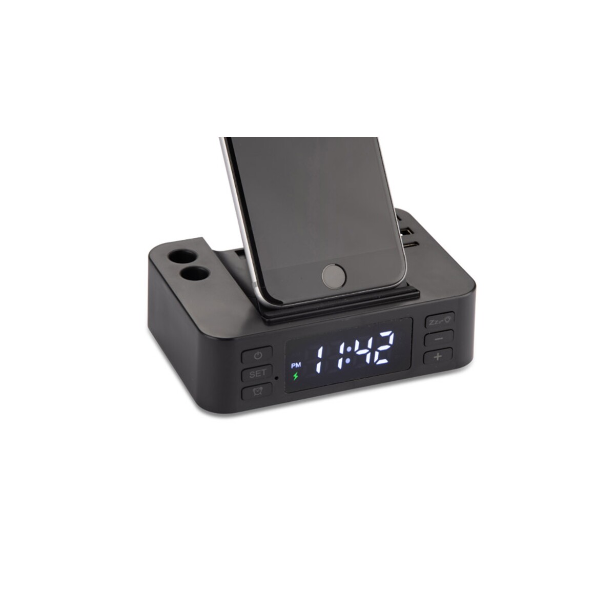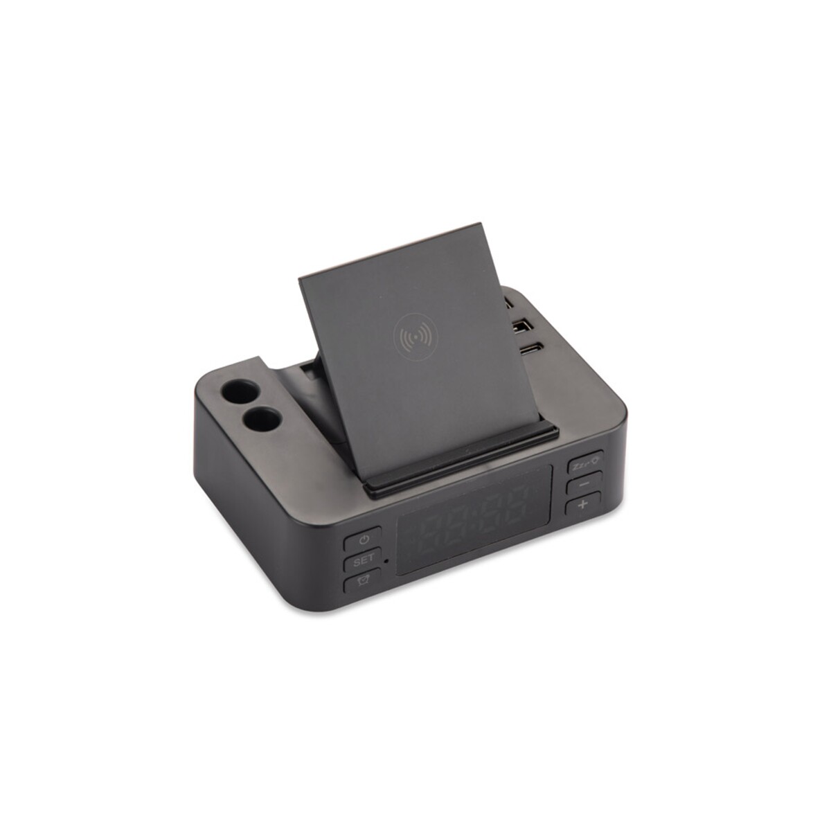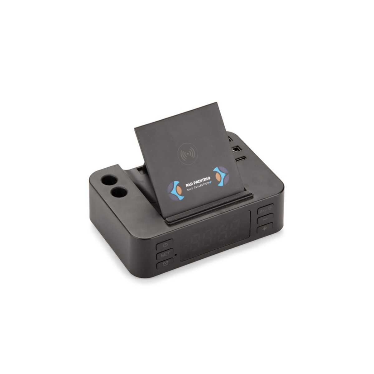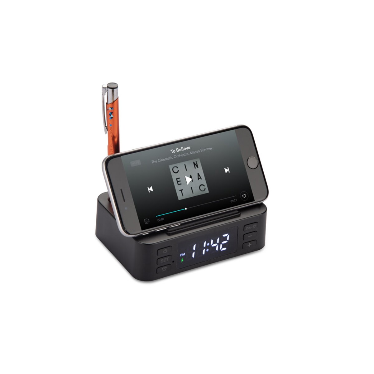 Budzik z ładowarką indukcyjną CLOCKI to znakomity sposób, by połączyć punktualność z pełnym energii porankiem. Ten multifunkcyjny gadżet łączy nowoczesny zegar z podstawką ładującą, dzięki czemu już nigdy nie zapomnisz naładować smartfona przed wyjściem z domu 😊. Wykonany z trwałego tworzywa w eleganckiej czerni i ważący jedynie 217 g, bez trudu odnajdzie się zarówno na biurku w biurze, jak i na stoliku nocnym. Wymiary 122 × 86 × 38 mm czynią go kompaktowym, a jednocześnie zapewniają wystarczającą powierzchnię na Twój nadruk czy logo.