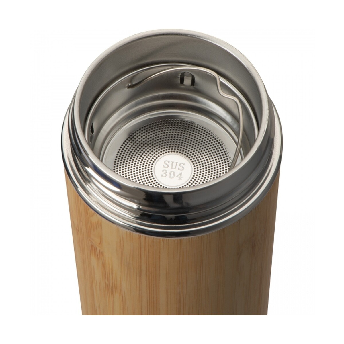 Ten praktyczny termos o podwójnych ściankach utrzymuje temperaturę napoju przez długie godziny, więc gorąca herbata i chłodna woda będą zawsze pod ręką. Sitko jest wyjmowane, co ułatwia czyszczenie oraz pozwala zaparzyć ulubione liście lub zioła bezpośrednio w naczyniu. Gładka, bambusowa powierzchnia świetnie eksponuje reklamowe grafiki, a naturalne usłojenie sprawia, że każda sztuka jest unikalna. To doskonały sposób, aby pokazać, że troszczysz się o detale i planetę jednocześnie.