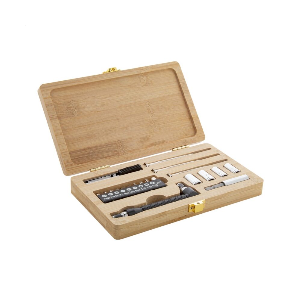 Cooter zestaw narzędzi to gadżet, który błyskawicznie przyciągnie uwagę klientów 🔧. W eleganckim, bambusowym pudełku znajdziesz aż 21 funkcjonalnych elementów: 1 śrubokręt nasadowy, 1 nóż do tapet, 3 precyzyjne śrubokręty, 10 bitów, 4 nakładki oraz 1 przedłużkę. Całość waży zaledwie 600 g i mieści się w wymiarach 195 × 112 × 30 mm, dzięki czemu bez trudu schowasz zestaw w szufladzie biurka czy torbie serwisowej. Naturalny odcień bambusa i chłodny połysk metalu tworzą znakomite połączenie, które podkreśla ekologiczny charakter produktu 🌱.