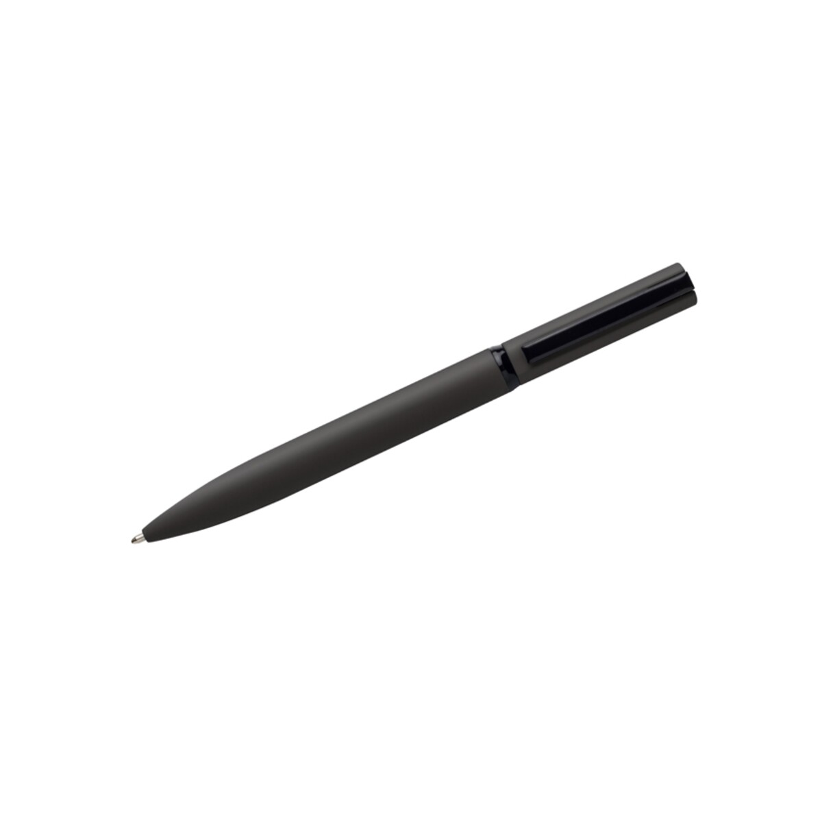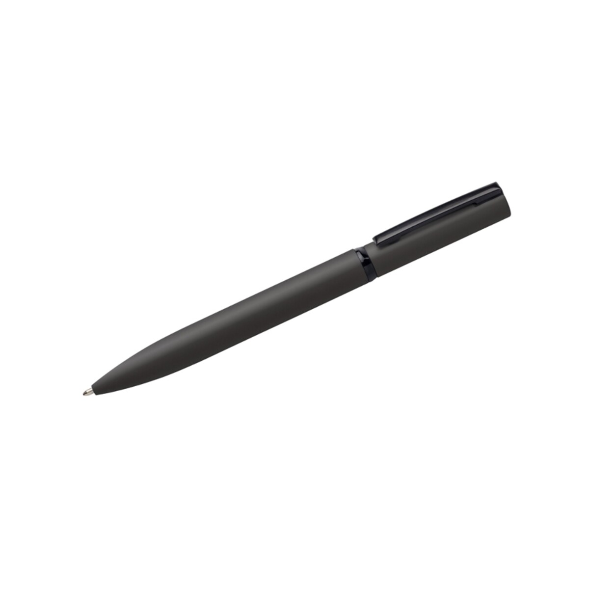Długopis SOLID MAT to połączenie solidności i szyku, które w perfekcyjny sposób podkreśli wizerunek każdej marki. Metalowy korpus o lekko asymetrycznej linii, pokryty przyjemną w dotyku gumowaną farbą o matowym wykończeniu, sprawia, że długopis świetnie leży w dłoni, a obrotowy mechanizm gwarantuje płynne wysuwanie wkładu. Starannie dobrany duet barw – elegancki szary lub klasyczny czarny – współgra z czarnym klipem i ringiem, tworząc ponadczasową stylistykę, która przyciąga wzrok 😊.