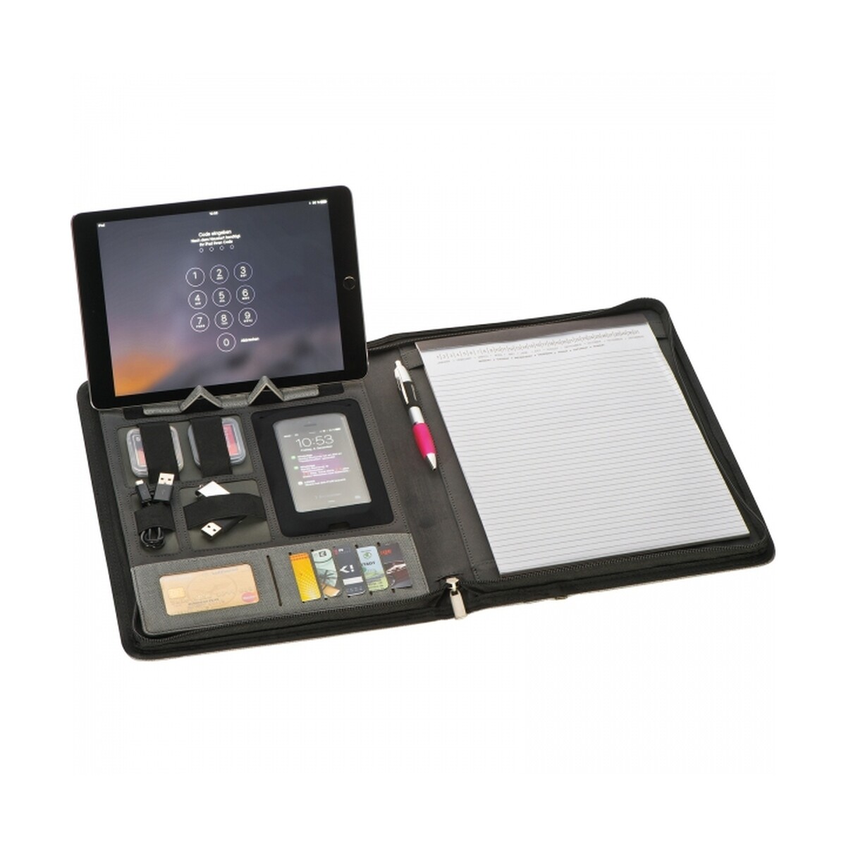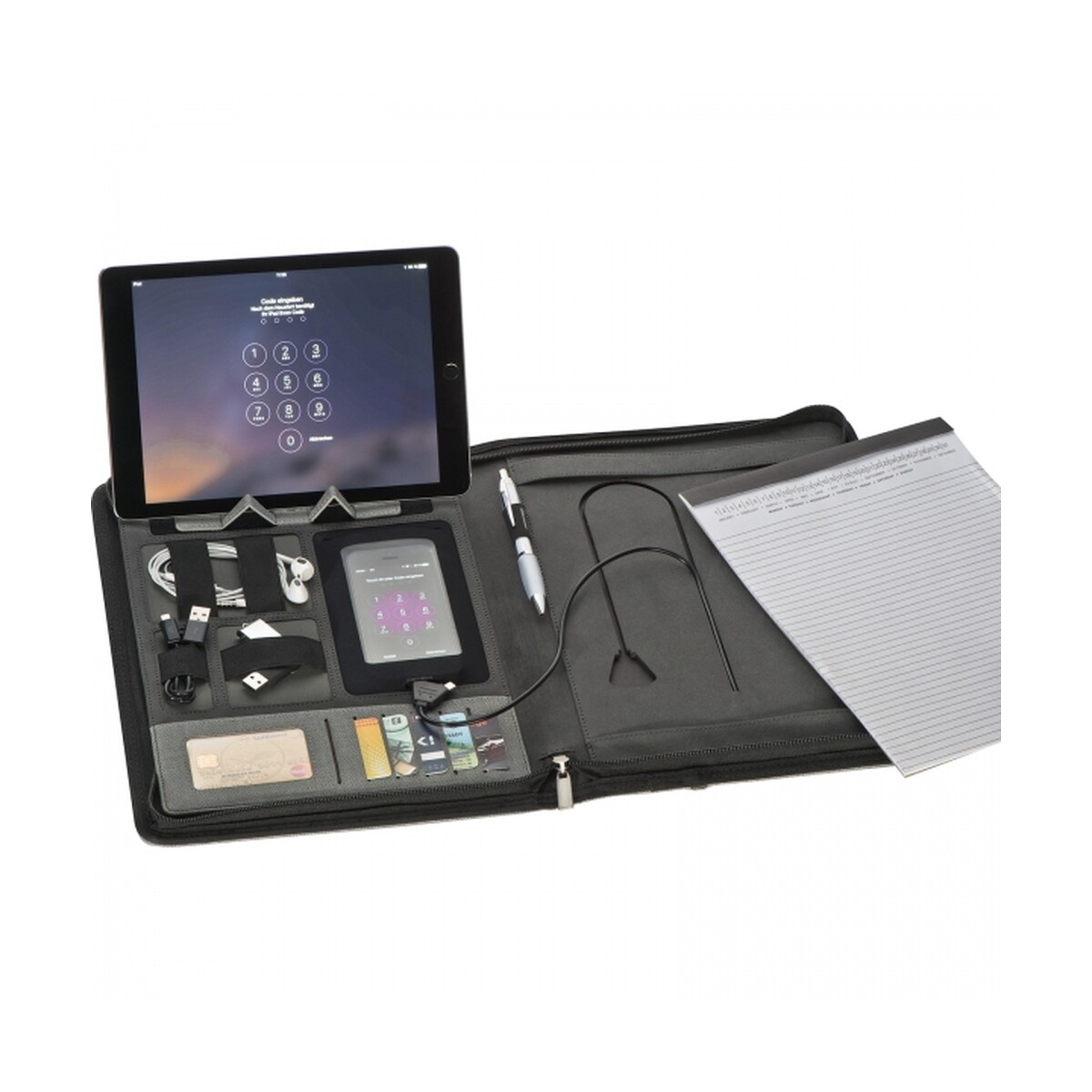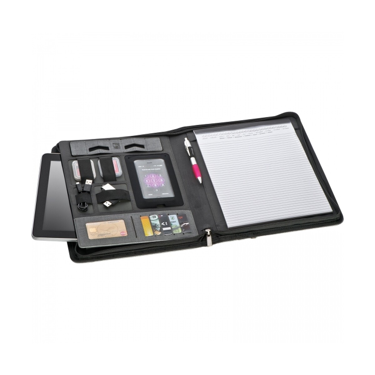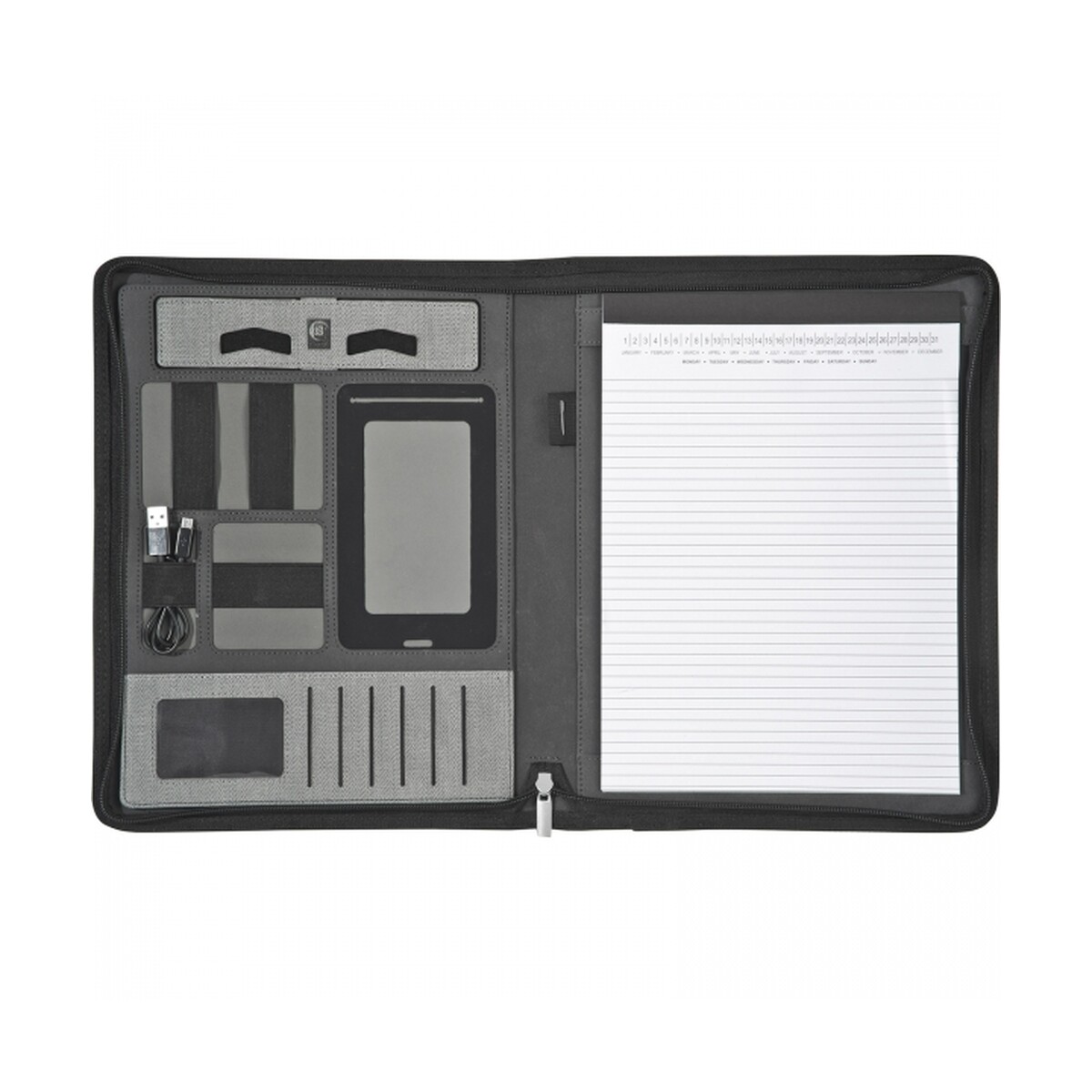 Wbudowany power bank o pojemności 5000 mAh z baterią litowo-polimerową zapewnia solidne 2,1 A wyjścia, co oznacza szybkie ładowanie smartfona lub tabletu nawet w podróży służbowej. Zintegrowany kabel 3 w 1 (Lightning, USB-C, micro USB) oraz dodatkowy przewód pod notesem gwarantują kompatybilność z większością urządzeń na rynku. Cechy produktu takie jak rozkładana podstawka na telefon, komplet przegródek na karty i elastyczna pętla na długopis czynią go kompletnym centrum dowodzenia.
