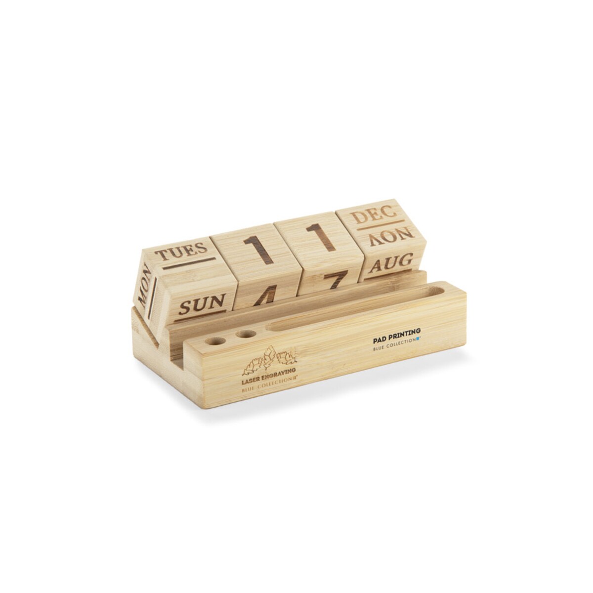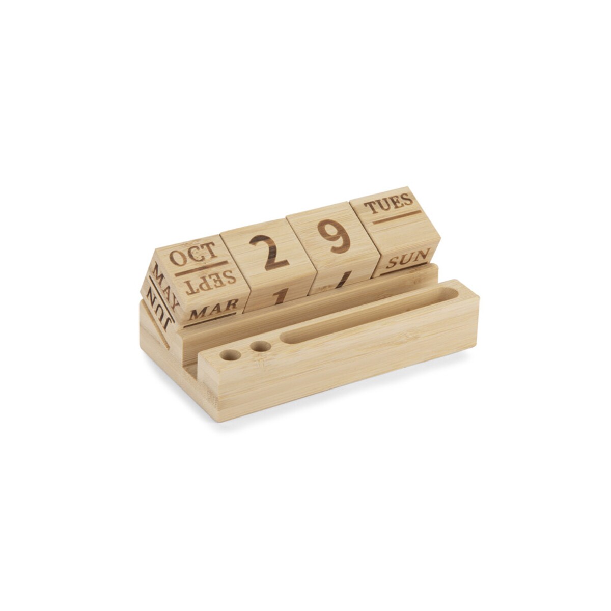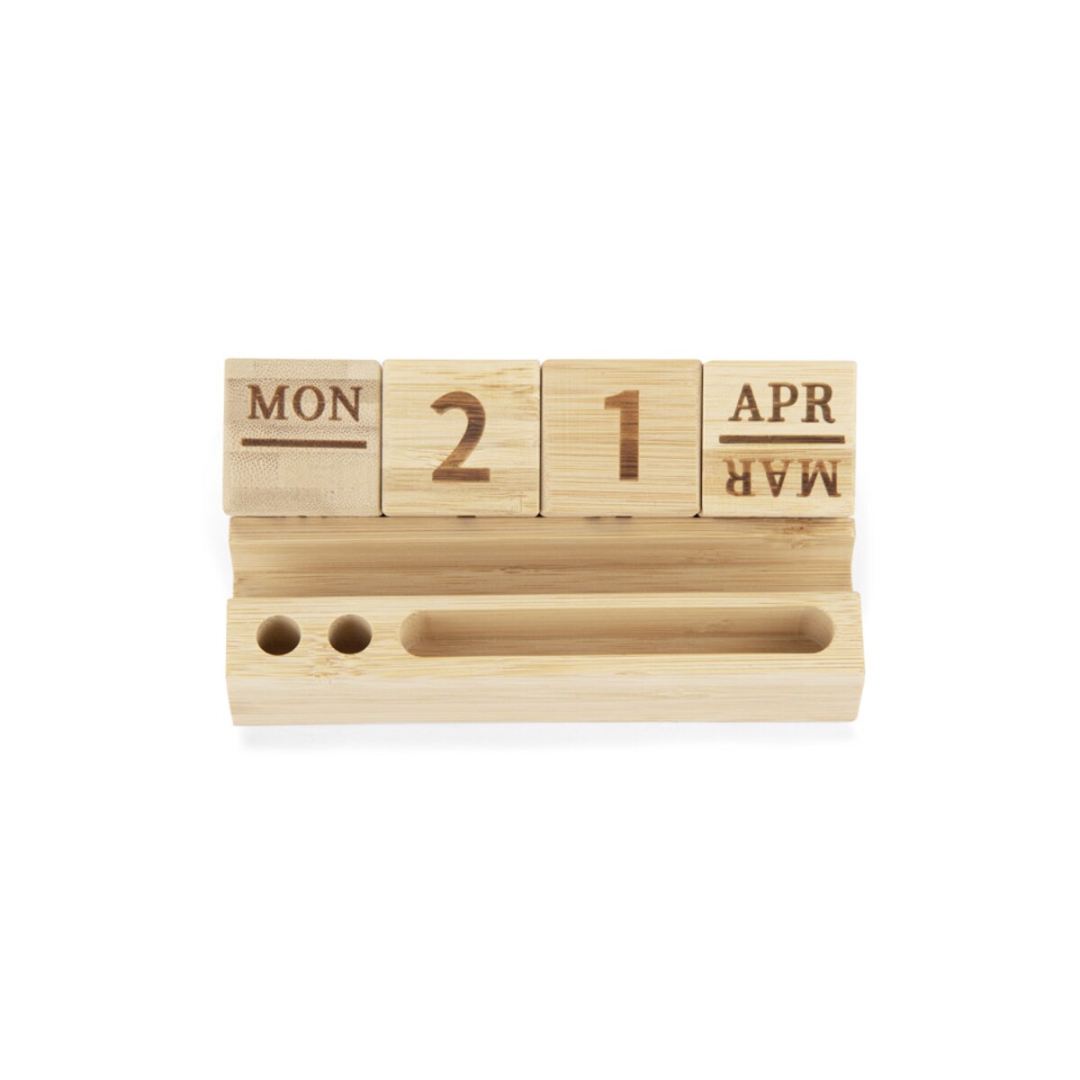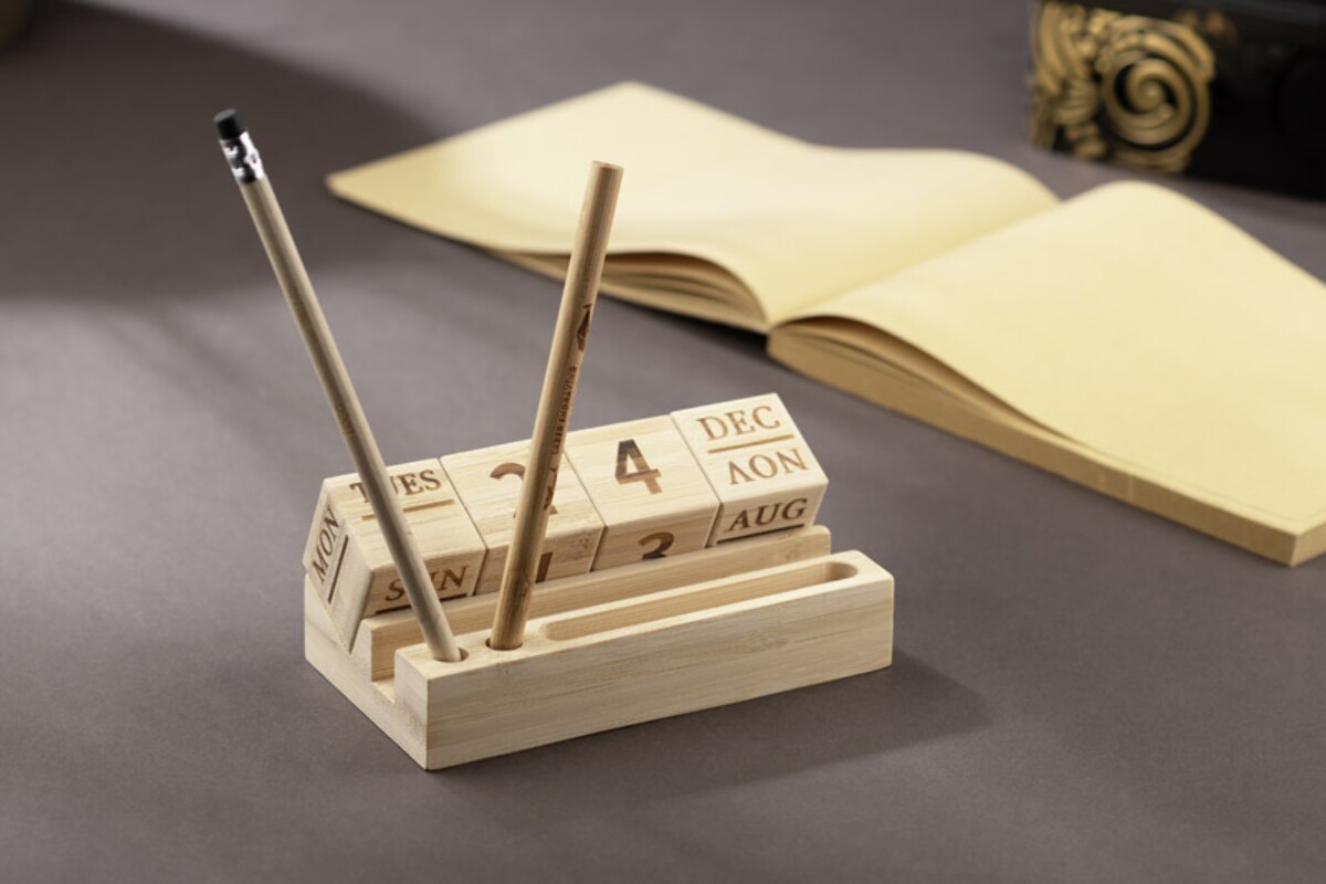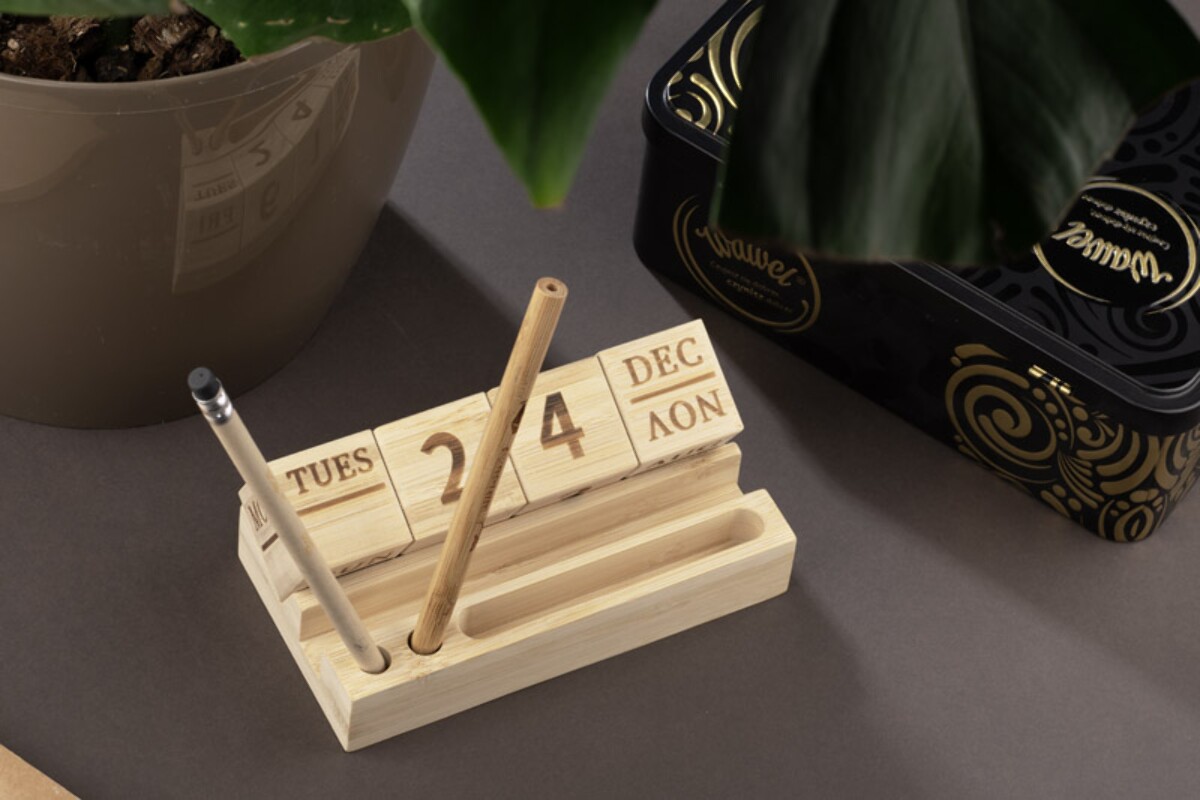 Kalendarz bambusowy NEN to niezwykle praktyczny i efektowny gadżet, który odmieni każde biurko 🌿. W całości wykonany z naturalnego bambusa, zachwyca ekologicznym charakterem i trwałością, dzięki czemu posłuży użytkownikowi przez długie lata. Wymienne bambusowe klocki z nazwą dnia tygodnia, liczbą dnia miesiąca i nazwą miesiąca czynią z niego wieczny kalendarz, który nigdy nie traci na aktualności. Dzięki przemyślanej konstrukcji pełni również rolę poręcznego stojaka: z łatwością uporządkujesz w nim długopisy, ołówki, spinacze, a nawet telefon.