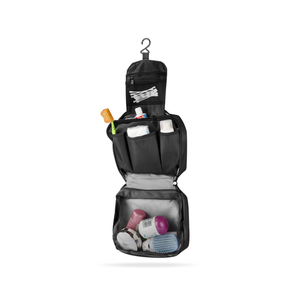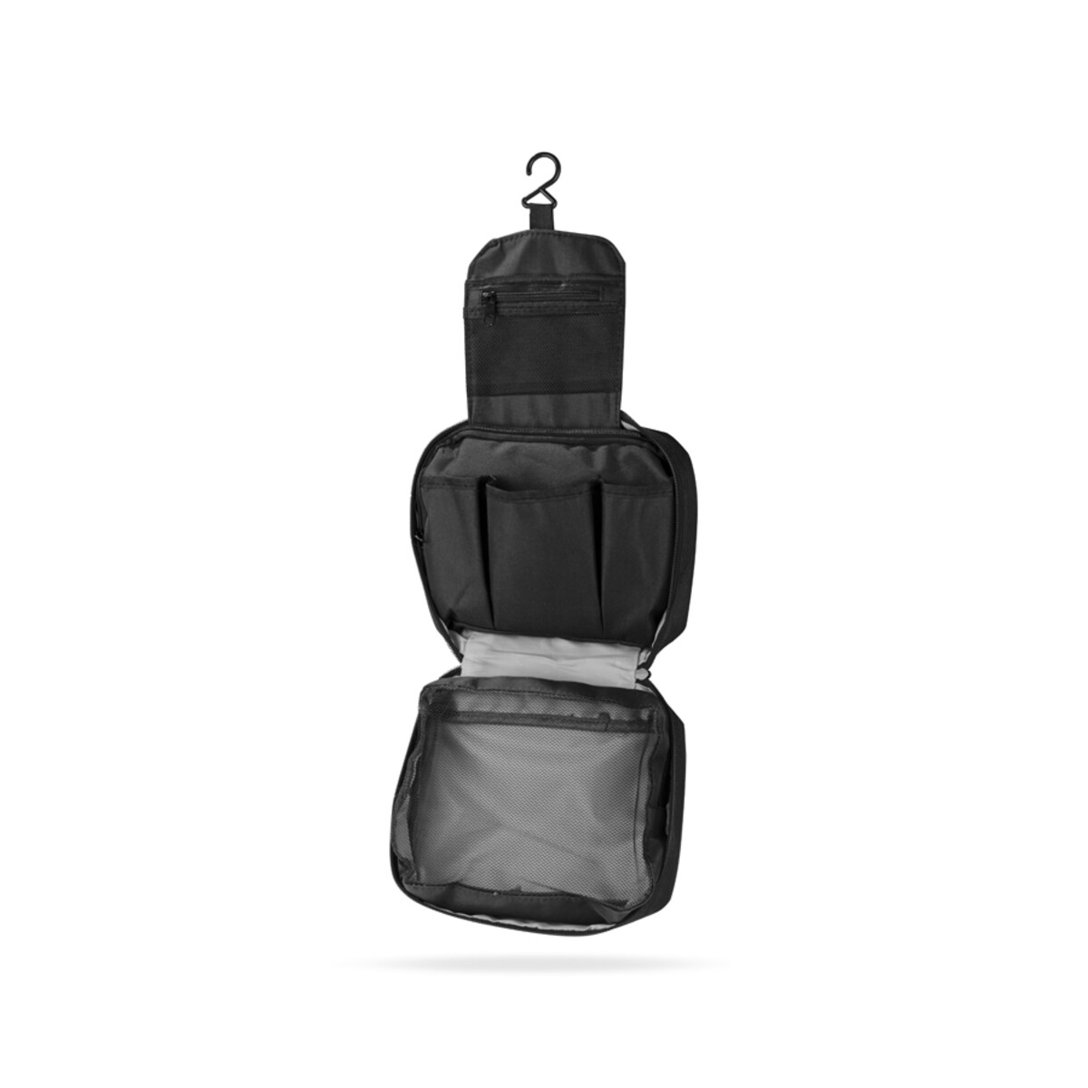 Kosmetyczka MURA to wyjątkowo praktyczny gadżet, który zamieni każdą służbową lub prywatną podróż w czystą przyjemność 😊. Jej kompaktowe wymiary 220 × 185 × 80 mm oraz niska waga 160 g sprawiają, że bez trudu zmieści się w torbie, plecaku czy walizce kabinowej, nie dodając zbędnych gramów bagażowi. Mocny poliester 300D w eleganckiej czerni prezentuje się stylowo i profesjonalnie, a zarazem chroni zawartość przed wilgocią oraz zabrudzeniami. Trzy przegródki i trzy kieszenie zamykane na zamek umożliwiają perfekcyjną organizację kosmetyków, akcesoriów higienicznych, a nawet drobnej elektroniki. Praktyczny wieszak pozwala swobodnie zawiesić kosmetyczkę na haczyku w hotelowej łazience czy w przedziale pociągu, oszczędzając cenną przestrzeń.