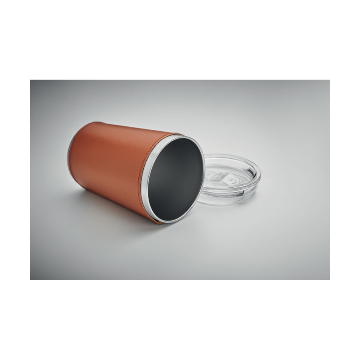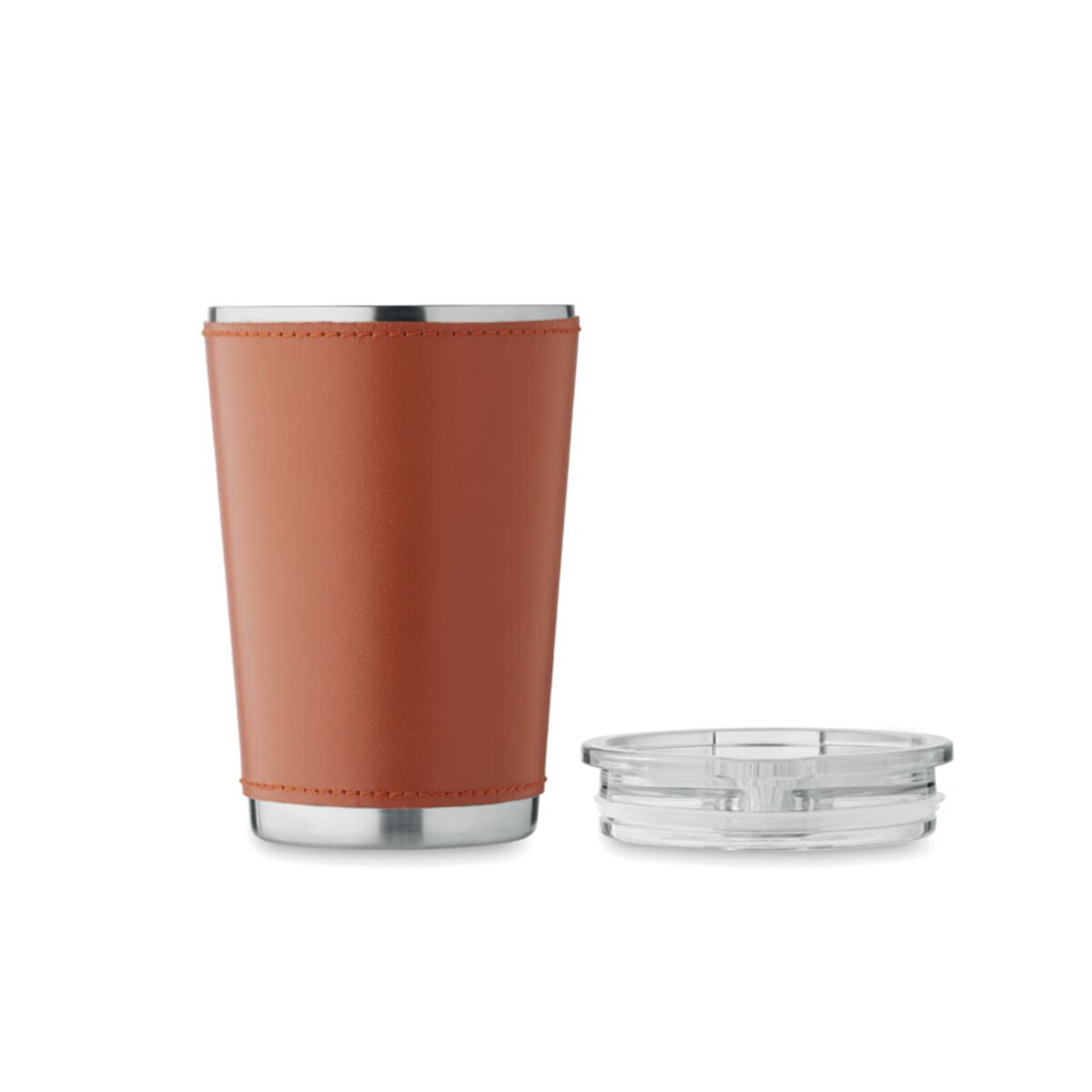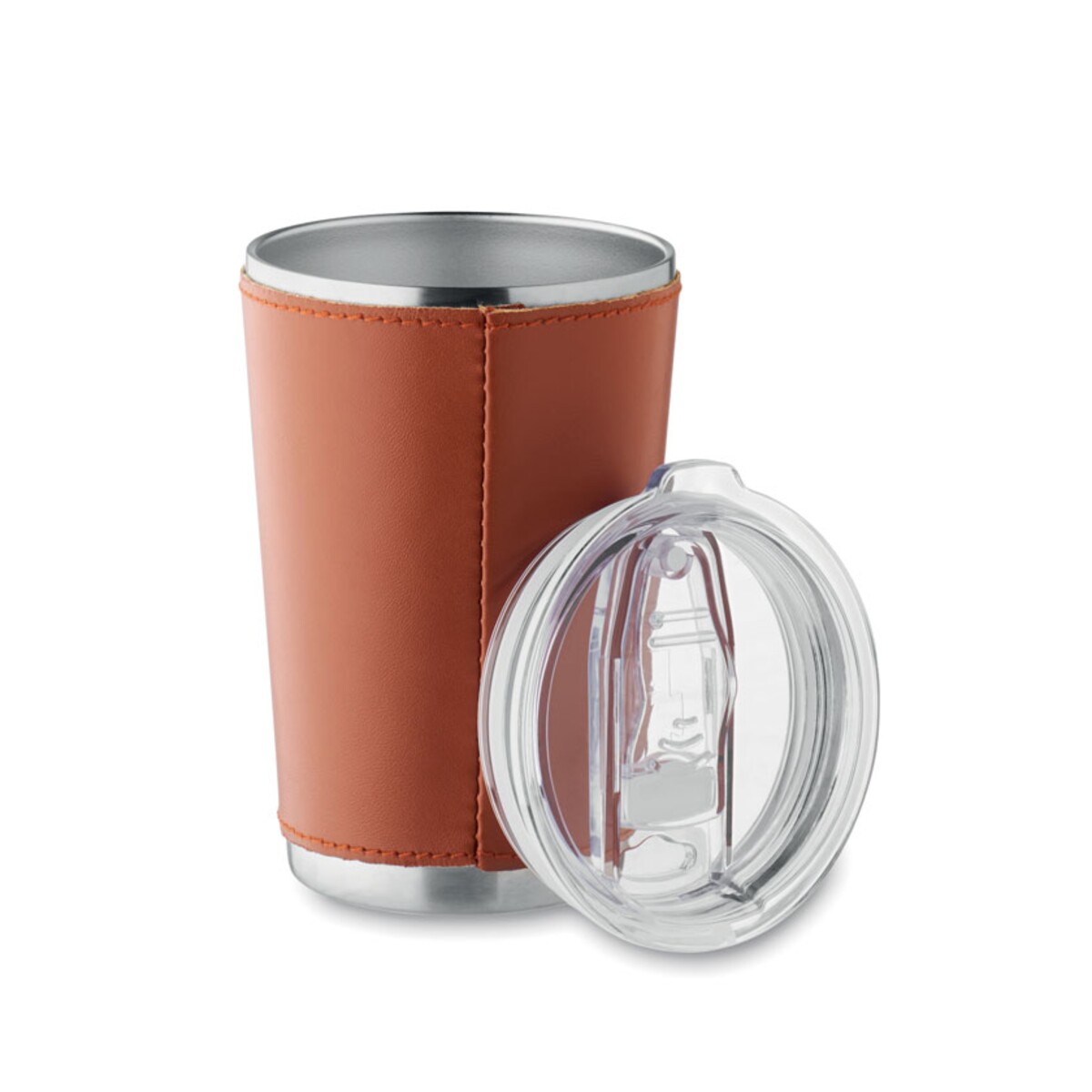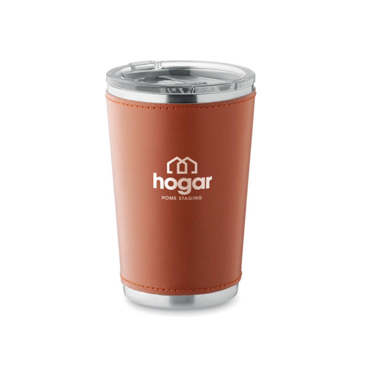 Kubek dwuścienny 350 ml TUMLADO to znakomity wybór, gdy szukasz praktycznego upominku reklamowego, który wyróżni się elegancją i troską o środowisko 🌿. Jego podwójne ścianki ze stali nierdzewnej w 90% pochodzącej z recyklingu chronią temperaturę napoju przez długie godziny, a zdejmowany pokrowiec z eko-skóry PU dodaje stylu i komfortu chwytu. Dzięki szczelnej pokrywce z zasuwanym otworem nie musisz martwić się przeciekaniem – to perfekcyjne rozwiązanie zarówno w biurze, jak i w podróży.