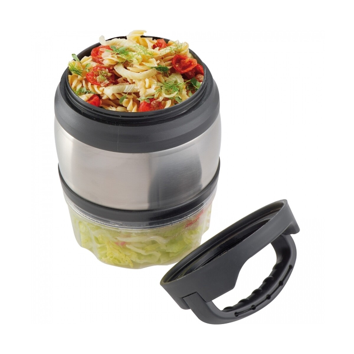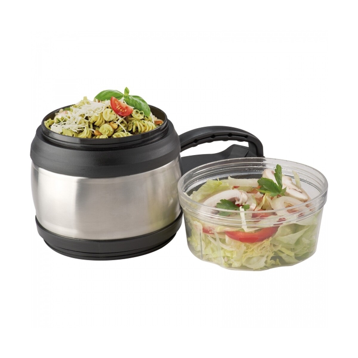 Lunch box 600 ml i 320 ml GIOIA to wyśmienity gadżet praktyczny zarówno w biurze, jak i w plenerze 😊. Dwuczęściowa konstrukcja łączy w sobie pojemnik o poj. 600 ml z podwójnymi ściankami oraz izolacją próżniową, a także drugi, przezroczysty pojemnik o poj. 320 ml. Solidna stal nierdzewna oraz trwały plastik gwarantują długą żywotność i łatwość czyszczenia. Kompaktowe wymiary ø 12,5 × 19,5 cm i waga zaledwie 0,417 kg sprawiają, że całość bez trudu zmieścisz w plecaku czy torbie fitness.