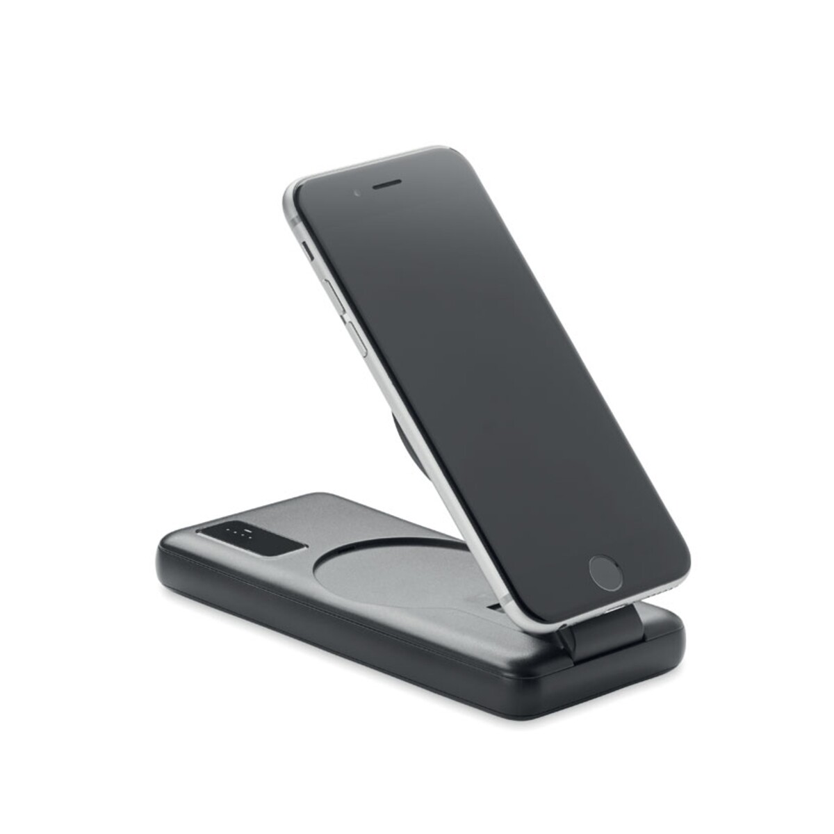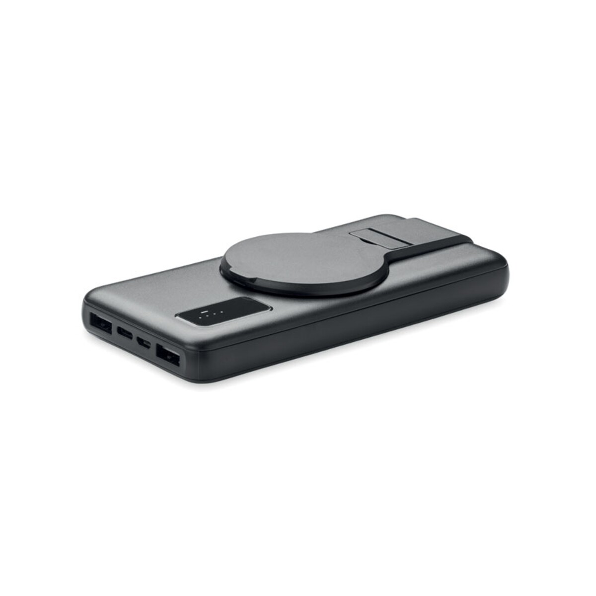 Magnetyczna ładowarka 15W CHARGE UP to nowoczesny, wielofunkcyjny gadżet, który łączy w sobie bezprzewodową ładowarkę o mocy 15W, pojemny power bank 10000 mAh i wygodną magnetyczną podstawkę pod telefon. Wykonany z trwałego ABS w eleganckim, czarnym kolorze, wyróżnia się kompaktowymi wymiarami 15 × 10 × 2,3 cm oraz wagą zaledwie 313 g – dzięki temu świetnie sprawdzi się w biurze, podczas podróży służbowych i na konferencjach 😊.