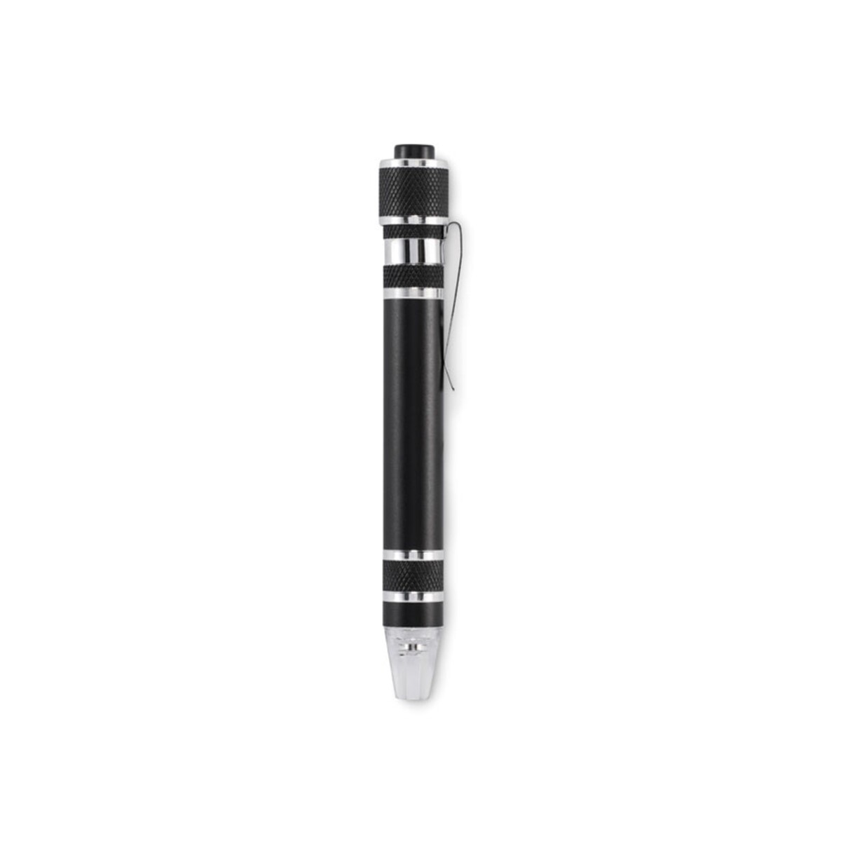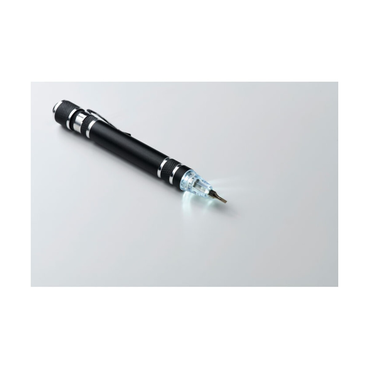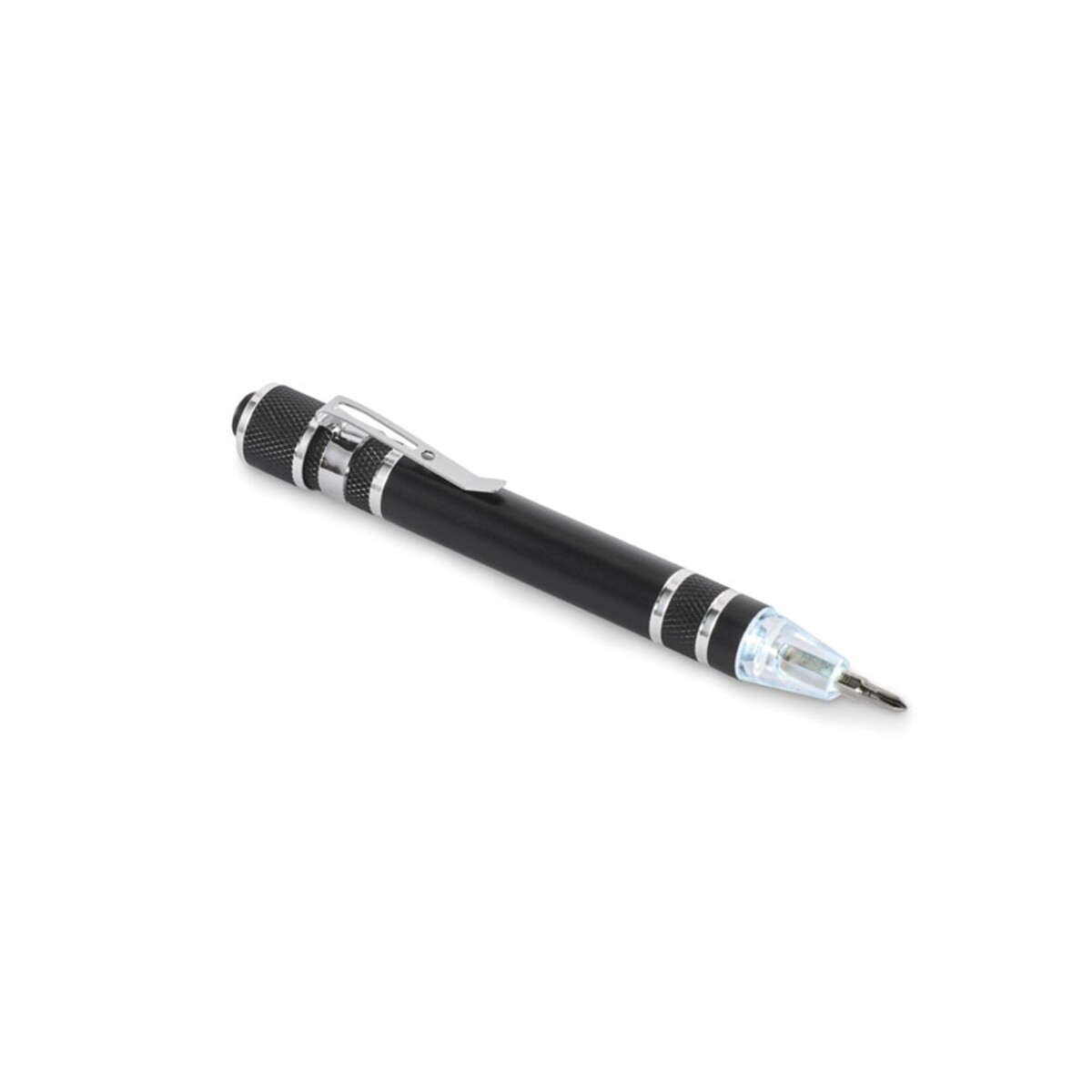 W obudowie o wymiarach 12,9 × ø1,58 cm i wadze zaledwie 0,047 kg skryto aż sześć bitów: 3 płaskie i 3 krzyżakowe, które można łatwo zamocować na magnetycznym trzpieniu. Zintegrowana latarka LED zasilana dołączonymi bateriami LR41 zapewnia punktowe światło tam, gdzie dostęp jest utrudniony. Do wyboru klasyczna czerń lub srebro – obie wersje idealnie eksponują firmowe logo i precyzyjny nadruk. Całość staje się wyśmienitą wizytówką jakości i innowacyjności.