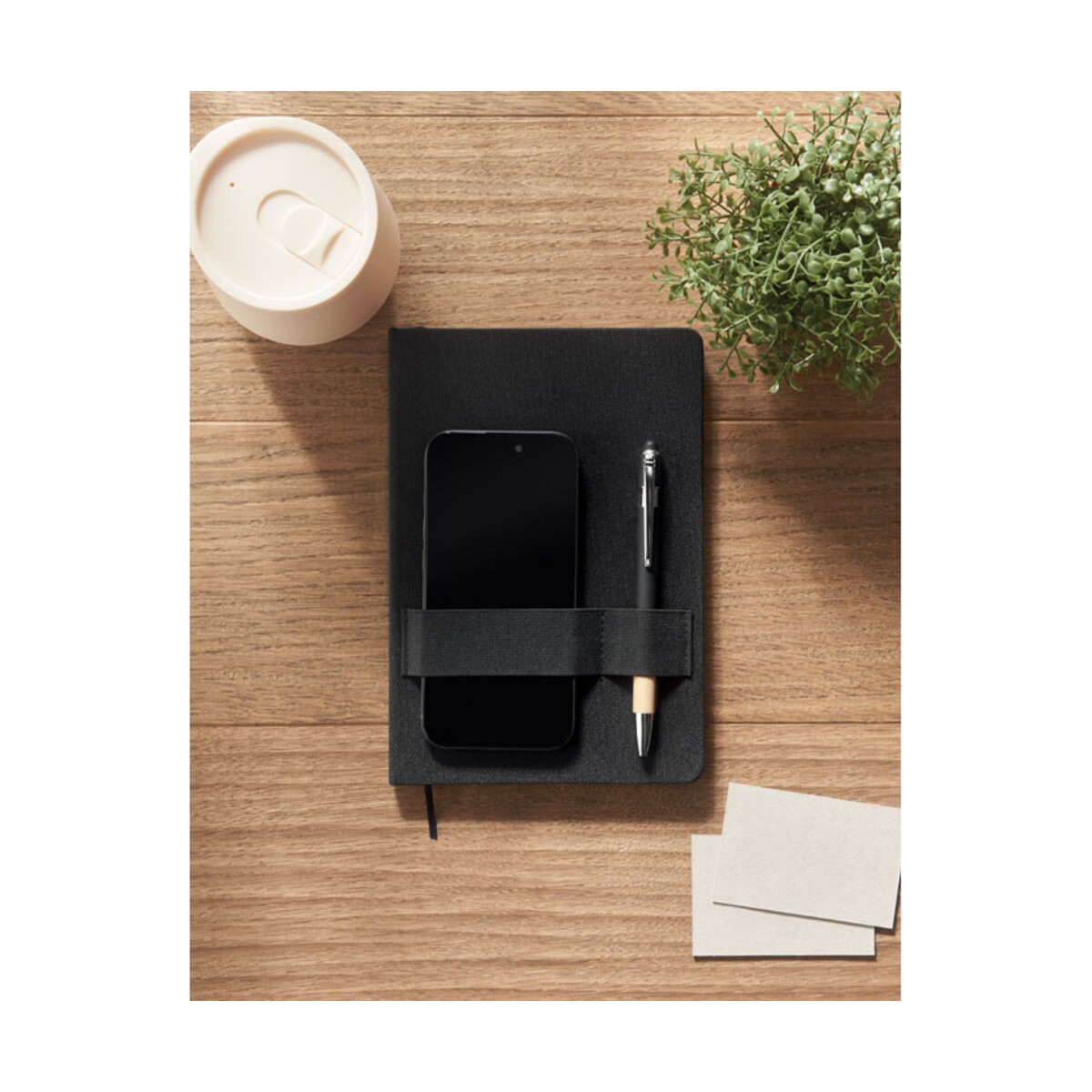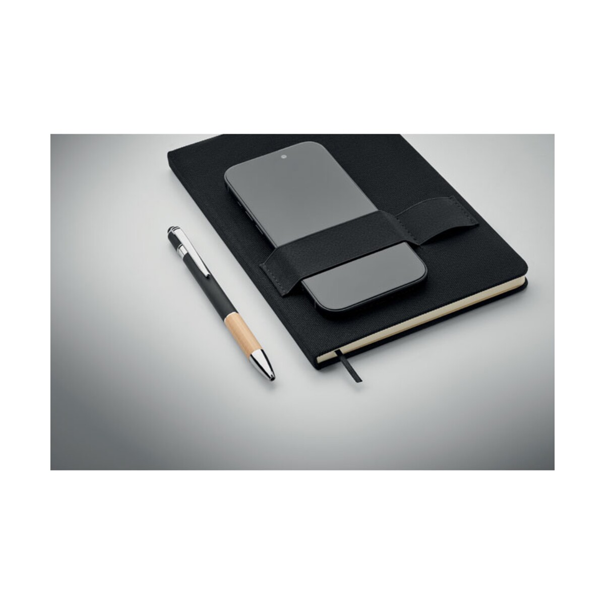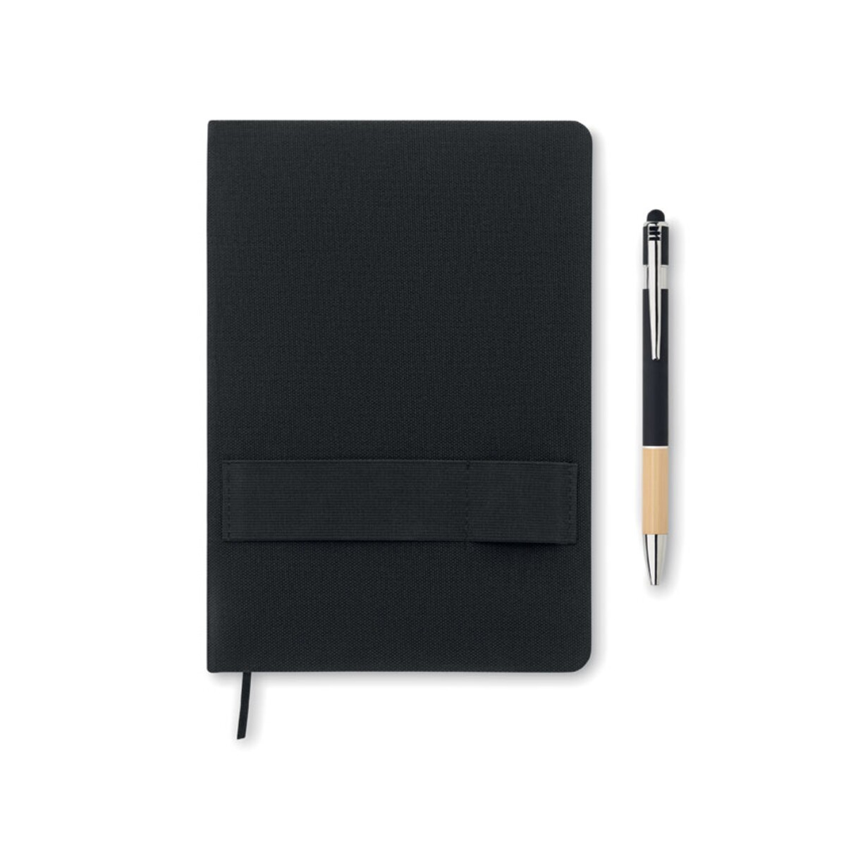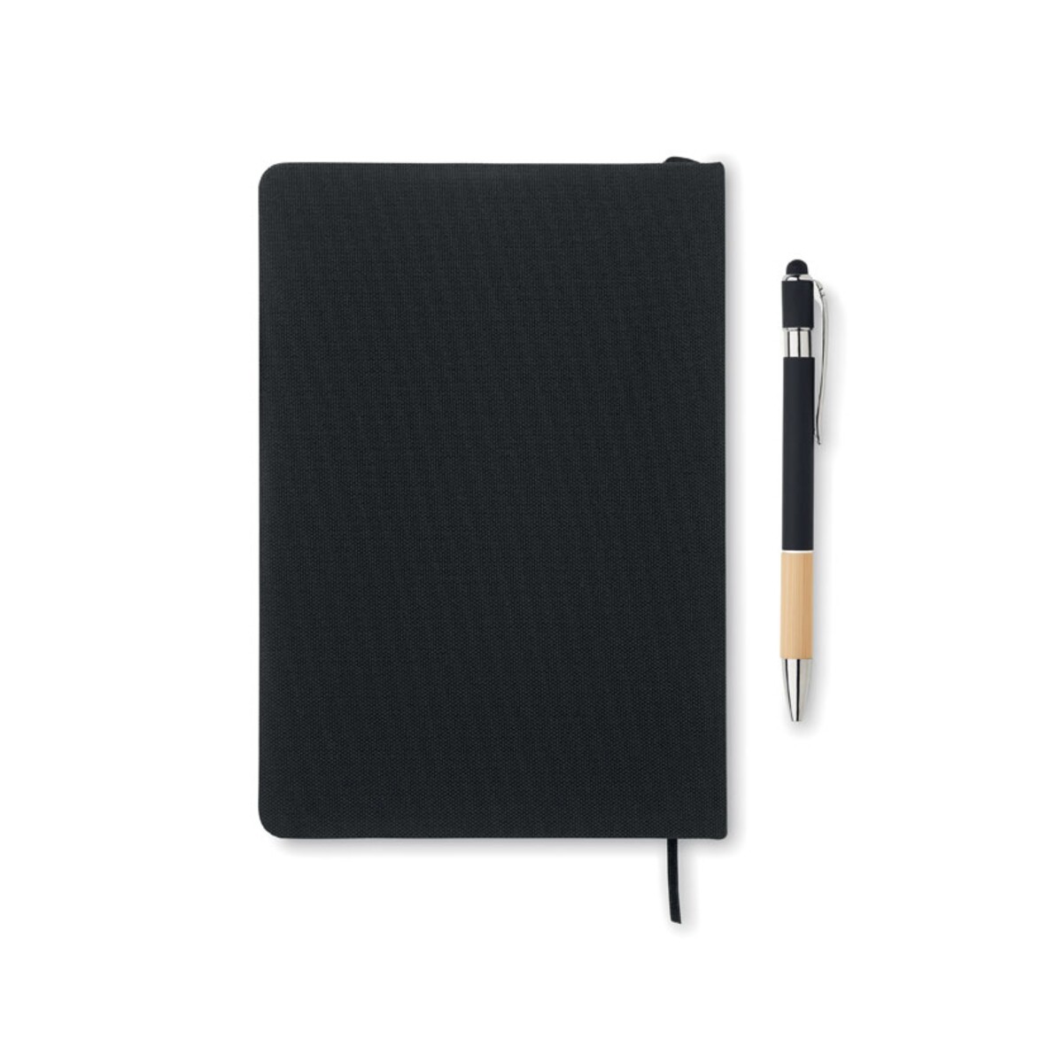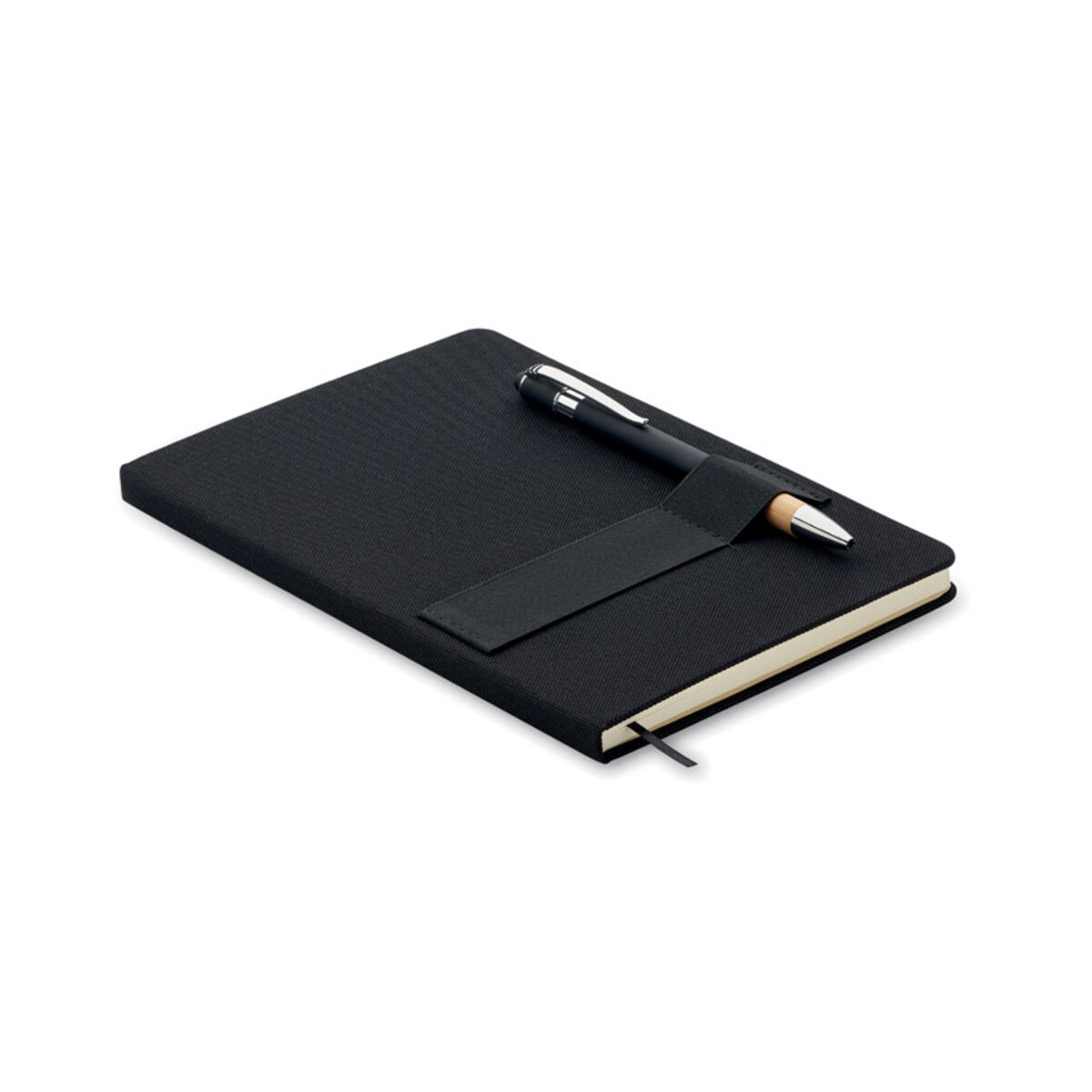 Notatnik A5 RPET z długopisem NOTA to nowoczesny, a zarazem elegancki gadżet, który skutecznie podkreśli wizerunek każdej marki. Wykonany z wytrzymałego materiału RPET 600D, zachwyca solidną, twardą okładką oraz przemyślanym układem 160 stron w linie z papieru z recyklingu. Wymiary 14,5 × 1,2 × 21 cm i lekka waga 0,300 kg sprawiają, że bez trudu zmieści się w torbie konferencyjnej czy plecaku studenta. Dołączony długopis z bambusowym uchwytem i niebieskim tuszem zawsze pozostaje pod ręką dzięki specjalnej pętelce, a elastyczna opaska na smartfon umożliwia wygodne notowanie i korzystanie z telefonu jednocześnie 😊.