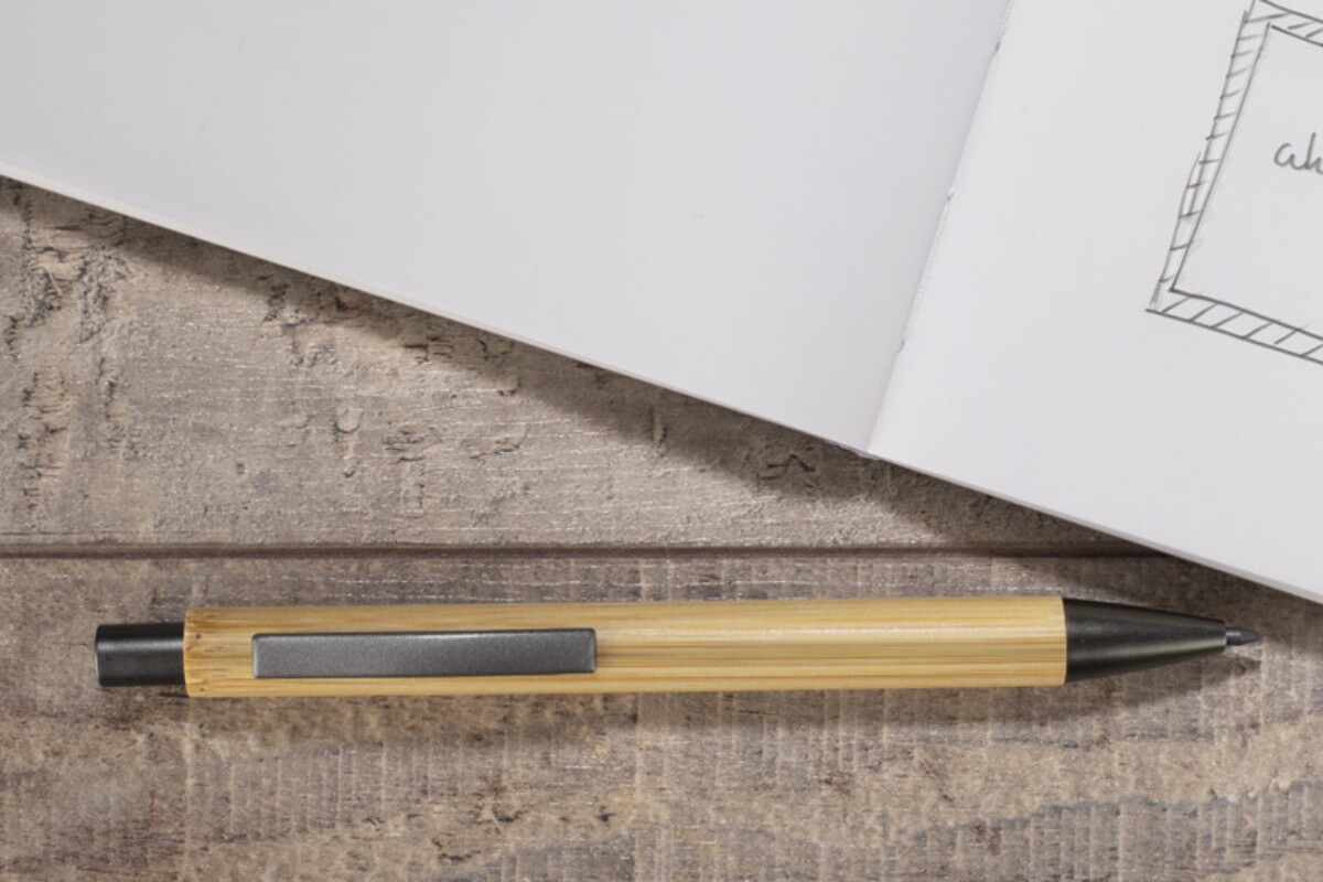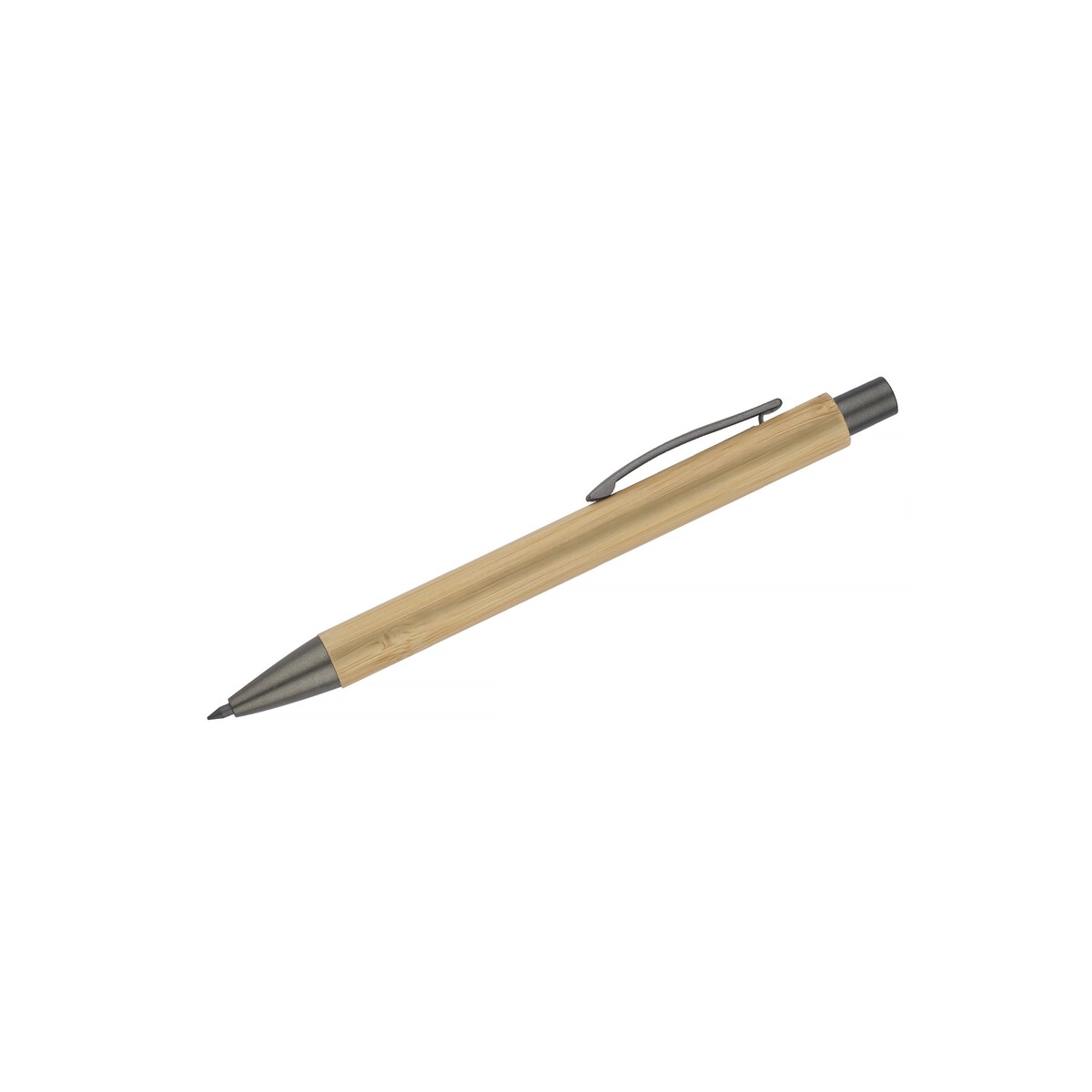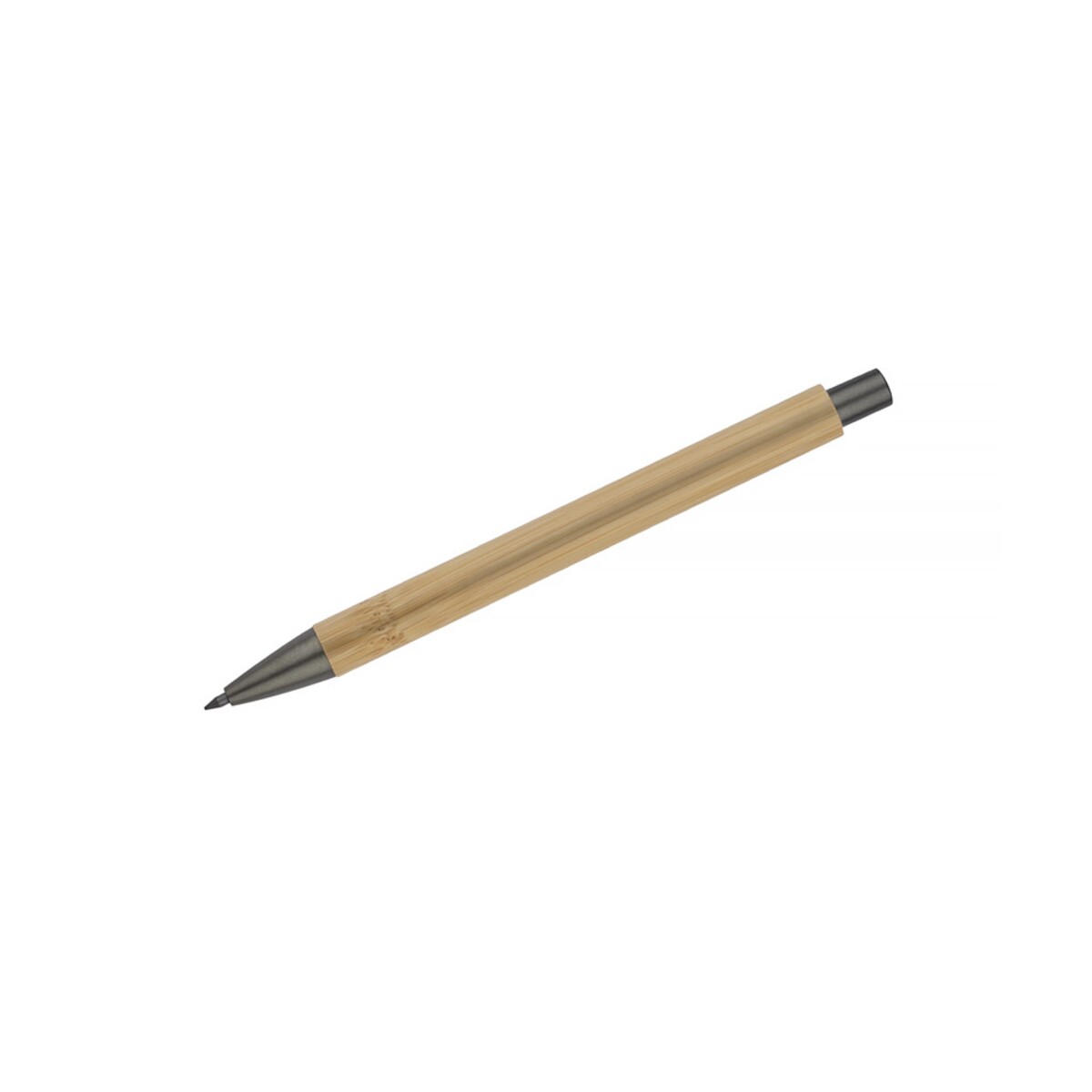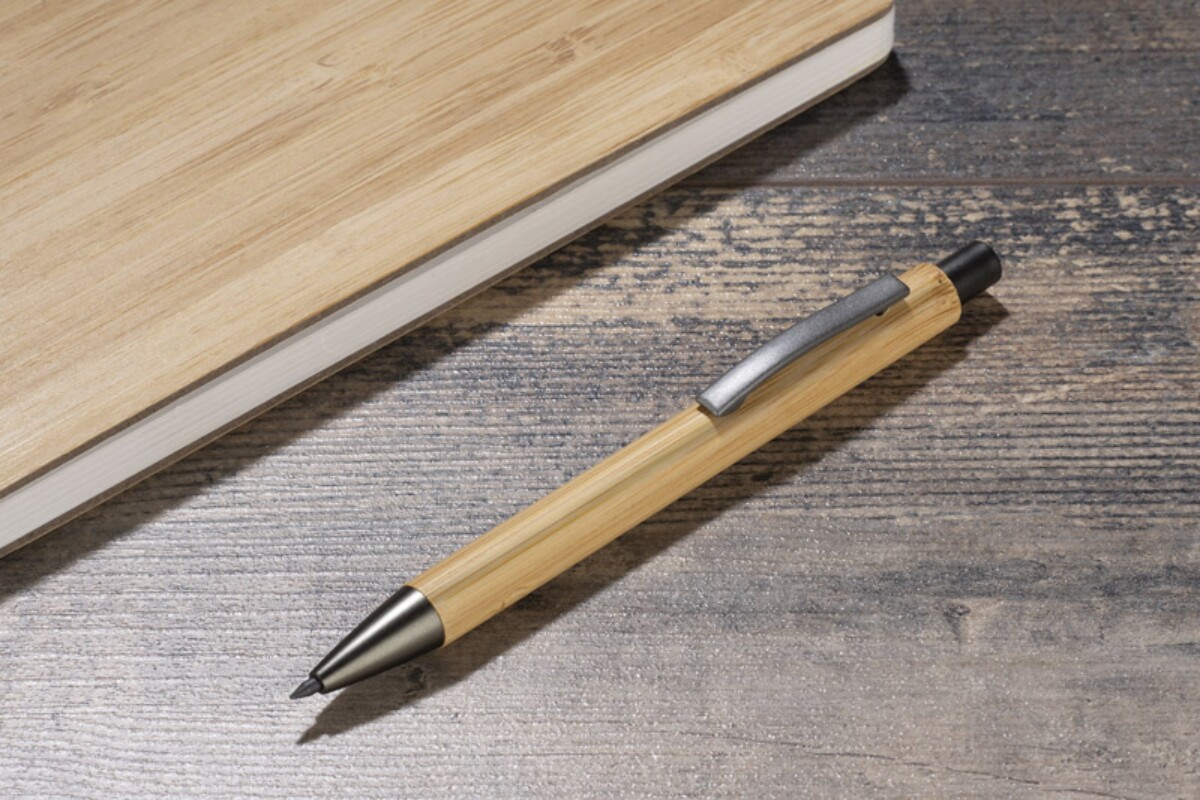 Ołówek EVER to prawdziwie ponadczasowy gadżet przeznaczony dla Twojej firmy, łączący ekologię z elegancją. Wykonany z naturalnego bambusa i uzupełniony metalowymi akcentami w kolorze grafitowym zachwyca lekkością – waży zaledwie 10 g – oraz kompaktowymi wymiarami 138 x ⌀ 11 mm. Dzięki specjalnemu, utwardzanemu rysikowi piszesz tak płynnie, jak świeżo zatemperowanym tradycyjnym ołówkiem, a jednocześnie nie musisz go ostrzyć. Mechanizm przyciskowy, znany z długopisów, gwarantuje wygodę i trwałość, a naturalny kolor bambusa doskonale eksponuje każde logo lub nadruk. 😊