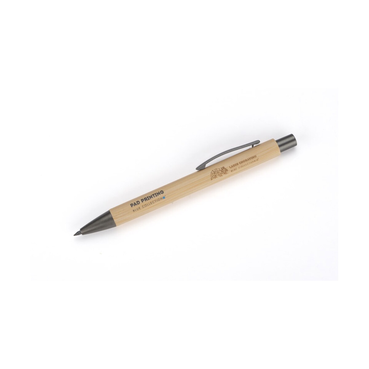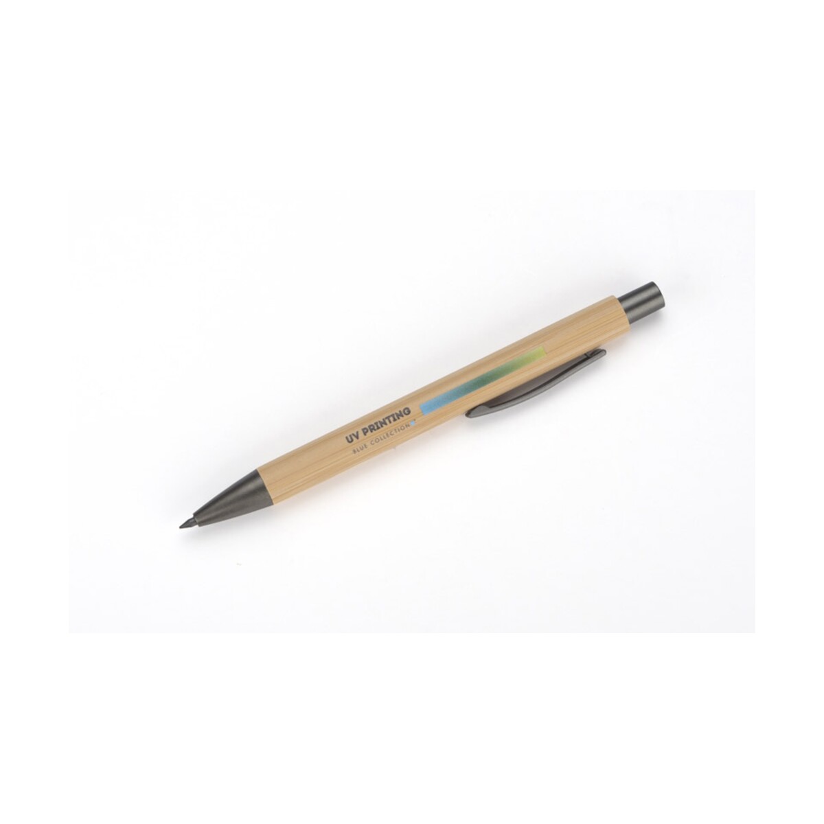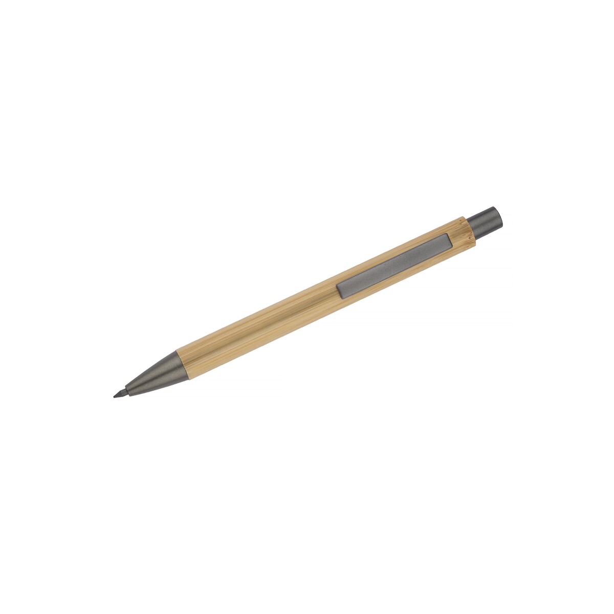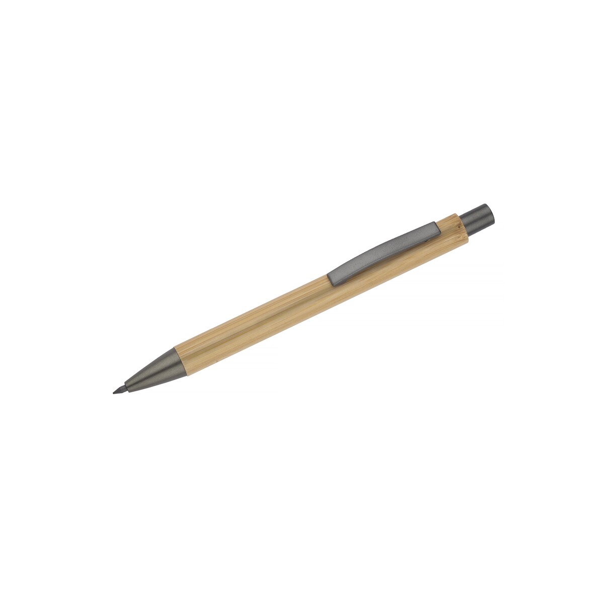Ołówek EVER to prawdziwie ponadczasowy gadżet przeznaczony dla Twojej firmy, łączący ekologię z elegancją. Wykonany z naturalnego bambusa i uzupełniony metalowymi akcentami w kolorze grafitowym zachwyca lekkością – waży zaledwie 10 g – oraz kompaktowymi wymiarami 138 x ⌀ 11 mm. Dzięki specjalnemu, utwardzanemu rysikowi piszesz tak płynnie, jak świeżo zatemperowanym tradycyjnym ołówkiem, a jednocześnie nie musisz go ostrzyć. Mechanizm przyciskowy, znany z długopisów, gwarantuje wygodę i trwałość, a naturalny kolor bambusa doskonale eksponuje każde logo lub nadruk. 😊