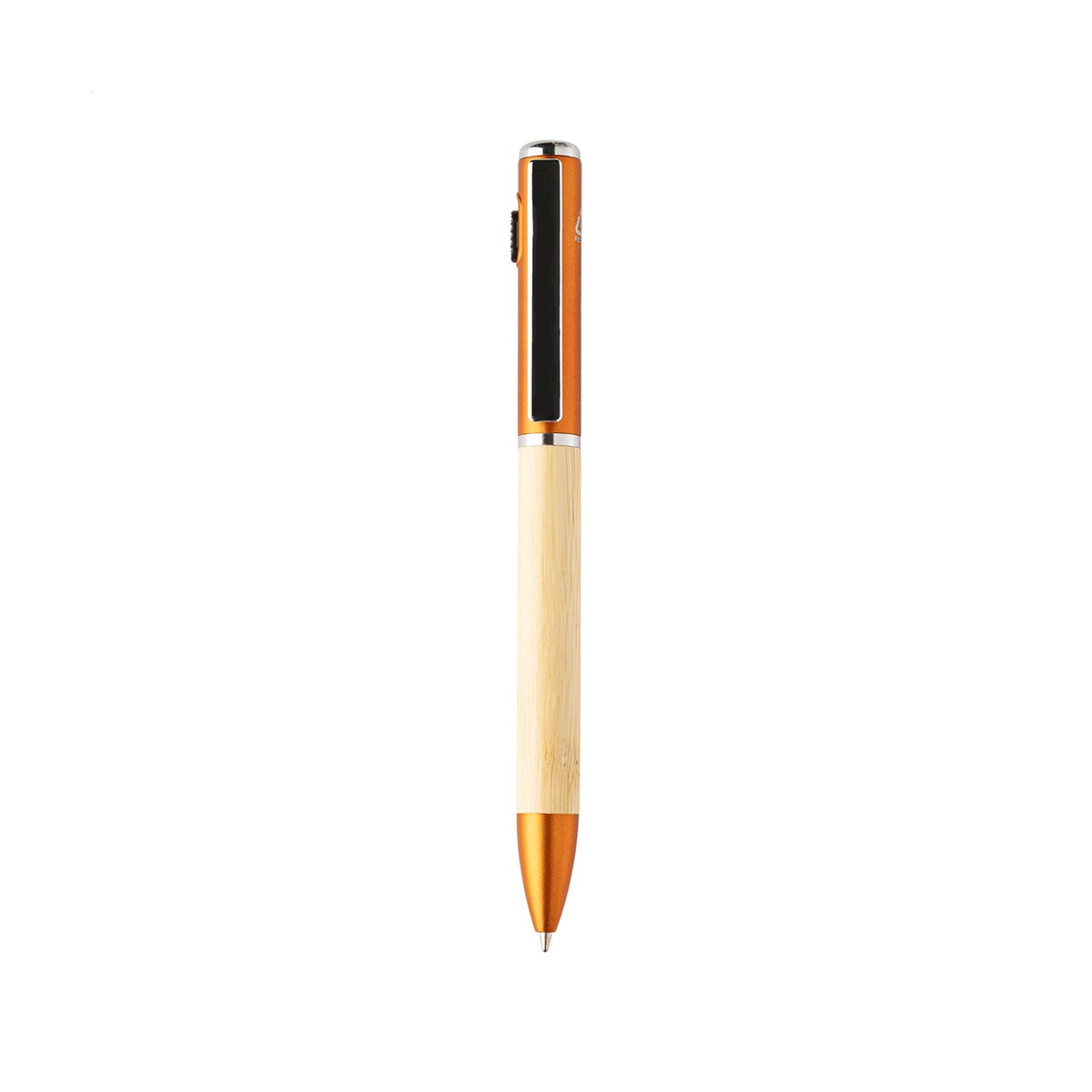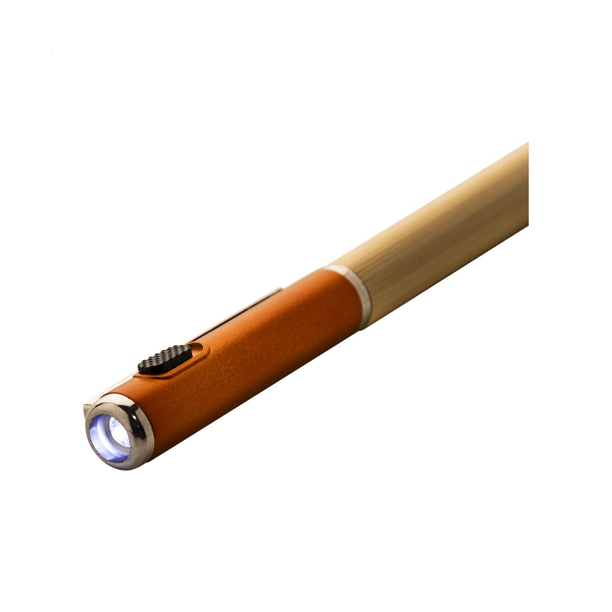 Cechy produktu: wymiary ø12×147 mm, waga 15 g, materiał: Bambus + ABS z recyklingu, niebieski wkład, latarka LED, bateria guzikowa w zestawie, kolory: pomarańczowy, zielony, czerwony, srebrny, niebieski, czarny. Taki zestaw parametrów czyni go perfekcyjną wizytówką Twojej marki, gotową pod każdy projekt reklamowy.