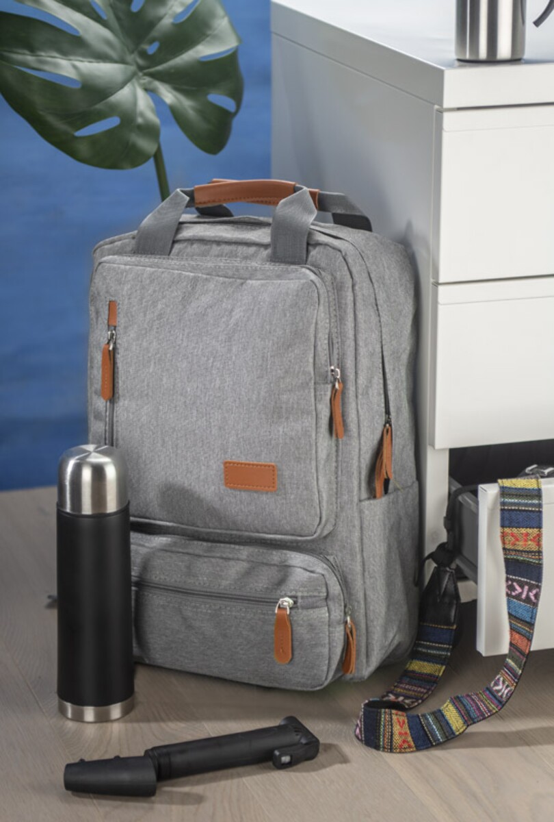 Plecak PAKKU to znakomity wybór, kiedy poszukujesz funkcjonalnego nośnika Twojego firmowego logo. Szlachetna szarość poliesteru 600D przełamana jasnobrązowymi wstawkami z ekoskóry sprawia, że ten plecak z kategorii Plecaki z logo prezentuje się nowocześnie i uniseksowo. Dzięki temu jest wprost stworzony na efektowny gadżet targowy czy upominek motywacyjny. Klienci i pracownicy z przyjemnością pokażą Twój nadruk w drodze do biura, na uczelnię lub podczas weekendowej wycieczki 🙂