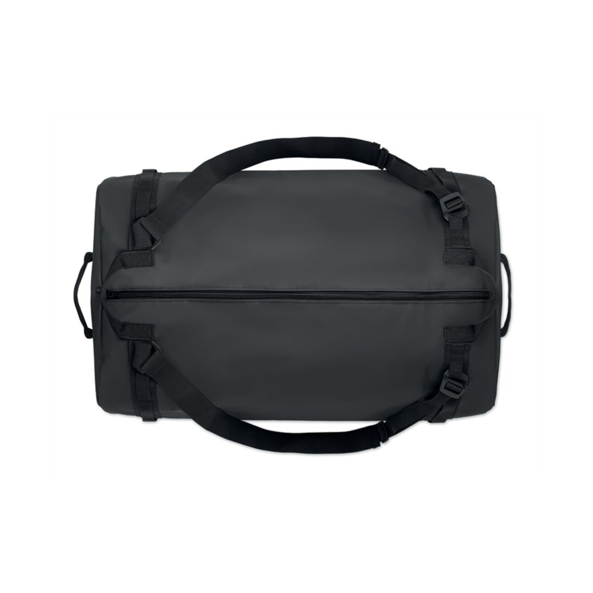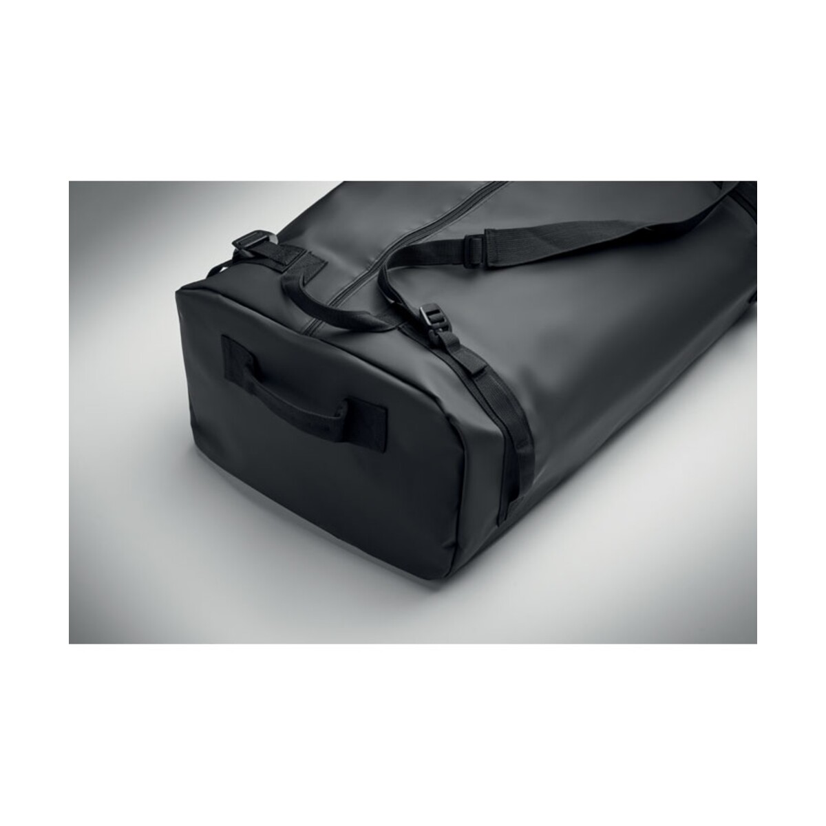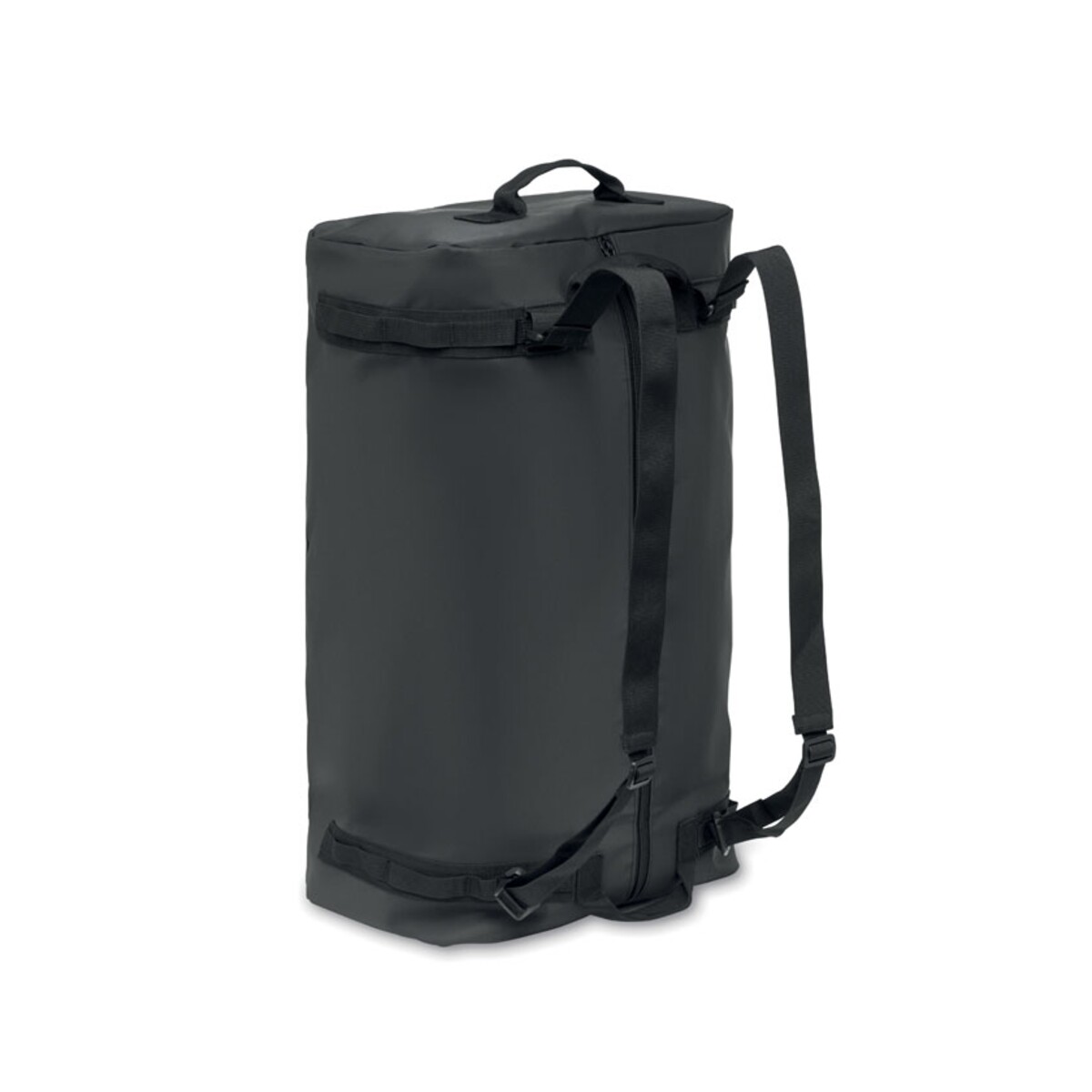 Podróżna torba tarpaulin MOUNTAIN ma przemyślaną konstrukcję: pojemną komorę główną z wewnętrzną, zapinaną na zamek przegrodą, odpinany i regulowany pasek na ramię oraz wygodne uchwyty pozwalające nosić ją również jak plecak. Wymiary 60×36×25 cm i waga 0,900 kg gwarantują odpowiednią pojemność przy zachowaniu niewielkiej masy, a materiał tarpaulin i kolor czarny podkreślają jej profesjonalny charakter. Podszewka wykonana z RPET wspiera działania proekologiczne Twojej marki.