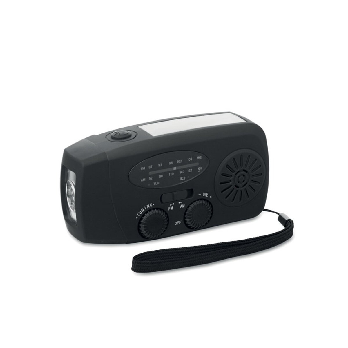 Przenośne radio z latarką LED ONDA to znakomity gadżet 2-w-1, który łączy funkcje odbiornika AM/FM, latarki LED z dwoma poziomami świecenia oraz powerbanku 1200 mAh. Niewielkie wymiary 13 × 5 × 6 cm i waga zaledwie 0,310 kg sprawiają, że urządzenie mieści się w plecaku czy schowku samochodowym, a wytrzymały materiał ABS gwarantuje trwałość w terenie. Zasilanie energią słoneczną i ręczną korbą daje pełną niezależność – na biwaku, podczas przerwy w dostawie prądu czy na pieszej wędrówce 😊. Powierzchnia obudowy w kolorze czarnym lub ciemnozielonym oferuje miejsce na wyraźny nadruk oraz logo, dzięki czemu model ONDA staje się praktycznym nośnikiem komunikatu reklamowego dla Twojej firmy.
