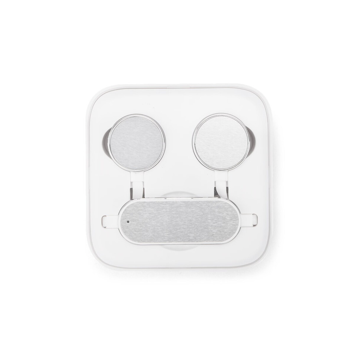 W zestawie znajdziesz poręczne, plastikowe etui o wymiarach 66 × 66 × 32 mm, w którym słuchawki ważące jedynie 66 g są zawsze bezpieczne. Technologia Bluetooth 4.2 gwarantuje stabilne połączenie, a pojemność baterii 55 mAh pozwala cieszyć się muzyką przez 4–5 godz.. W trybie czuwania wytrzymują imponujące 120 godz., a pełne naładowanie zajmuje tylko 2 godz.. Kompaktowe wymiary słuchawki ø 20 × 23 mm i dołączony kabel o długości 590 mm zapewniają komfort noszenia, a klasyczna, biała kolorystyka pasuje do każdego stylu. 🙂