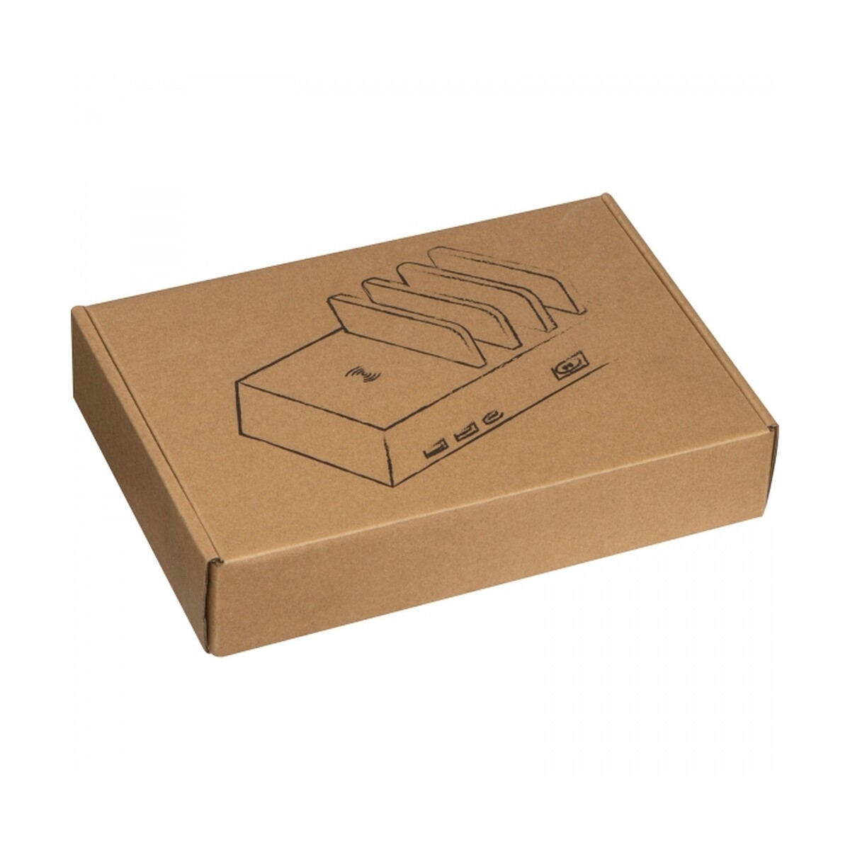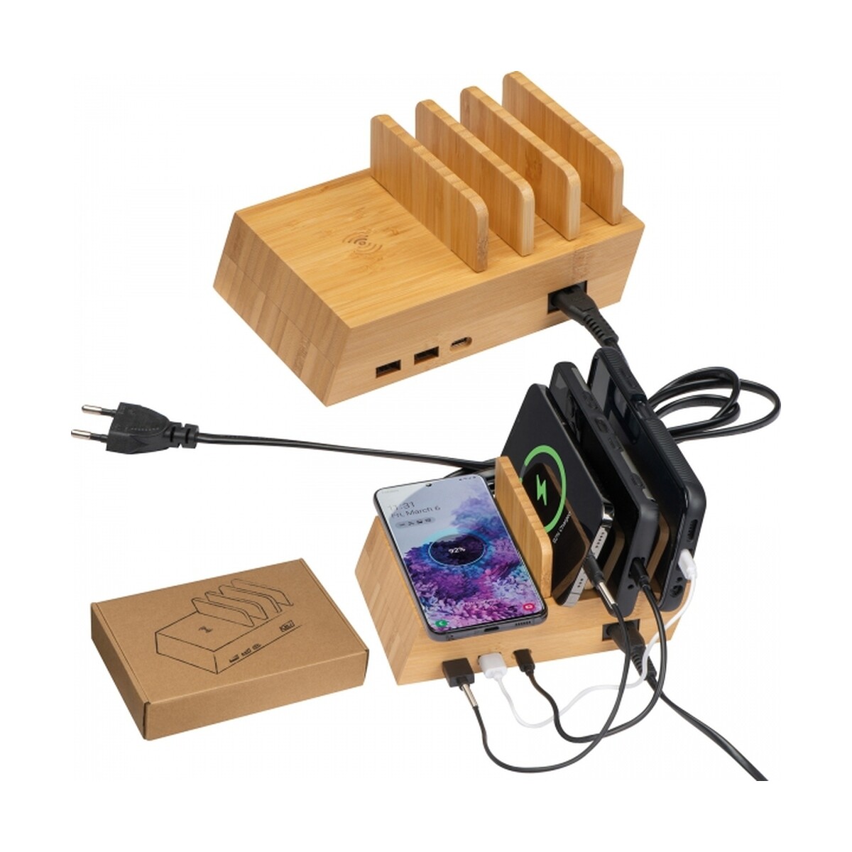 Stacja ładująca indukcyjna KENNETH to innowacyjny, wielofunkcyjny gadżet, który zamieni każde biurko w centrum energii ⚡. Wykonana z naturalnego bambusa, wpisuje się w ekologiczne trendy i prezentuje się wyjątkowo elegancko, a jednocześnie stanowi trwałą bazę pod efektowny nadruk lub Twoje firmowe logo. Jej kompaktowe wymiary 17,5 x 11,5 x 7,7 cm i waga zaledwie 0,8 kg sprawiają, że łatwo przenieść ją z sali konferencyjnej do domu czy na event targowy. Ta reklamowa stacja wyposażona została w ładowanie indukcyjne z miejscem aż na cztery urządzenia, a dodatkowo posiada dwa porty USB oraz jeden port typu C, co umożliwia jednoczesne zasilanie praktycznie każdego smartfona i akcesorium. Kabel zasilający znajduje się w zestawie, więc produkt jest gotowy do użycia od razu po rozpakowaniu.
