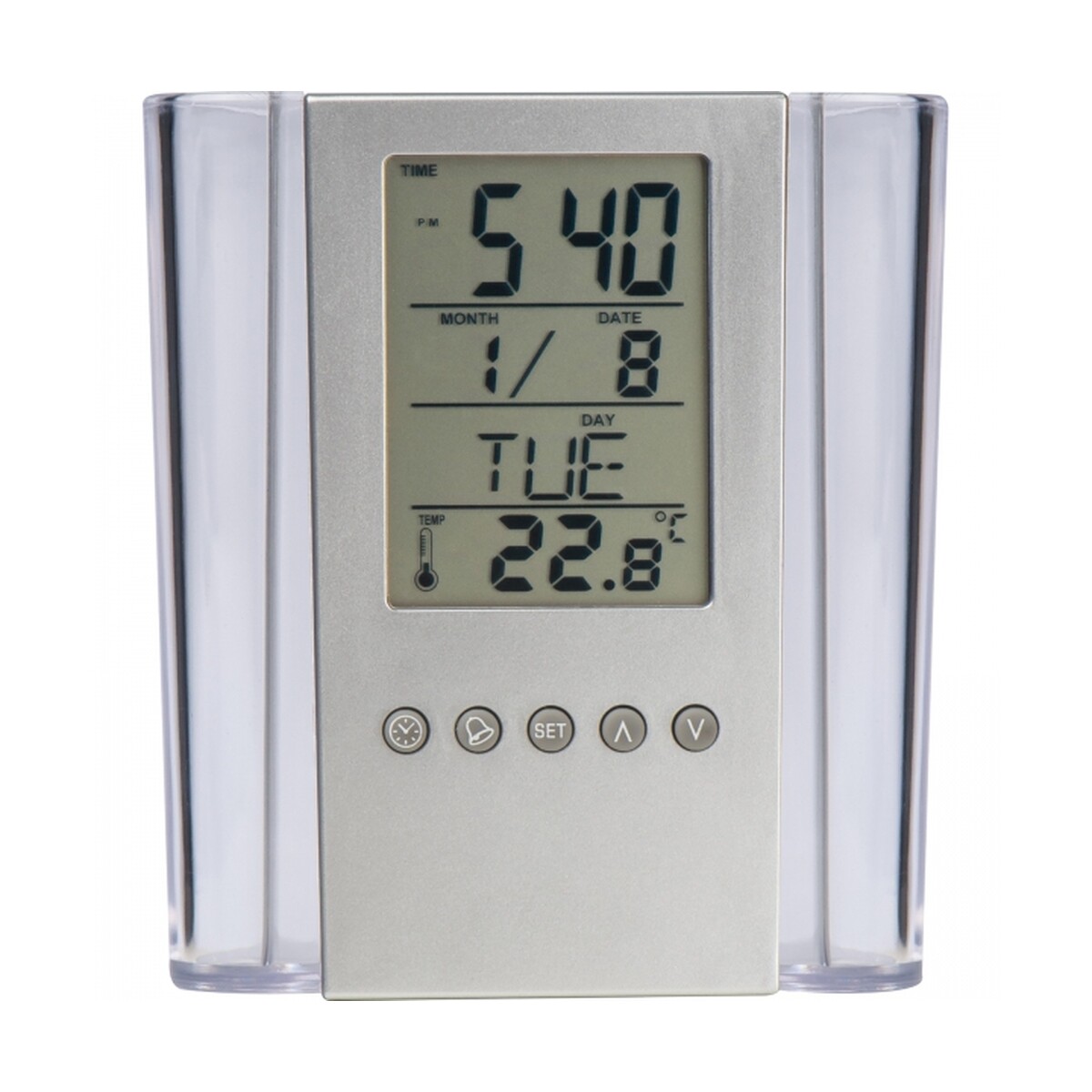 Stojak biurkowy wielofunkcyjny CrisMa MARKUS to sprytne połączenie nowoczesnej lampki, zegara i organizera, które podniesie funkcjonalność każdego stanowiska pracy. Wykonany z przezroczystego akrylu i plastiku o wymiarach 10,5 × 5,5 × 12,5 cm oraz wadze 0,211 kg, przyciąga wzrok subtelną formą i dyskretnym podświetleniem. Na froncie, tuż pod klawiszami funkcyjnymi, przewidziano miejsce na logo, dzięki czemu powstaje unikalny gadżet reklamowy wspierający wizerunek marki 😊. W komplecie znajdują się baterie, więc użytkownik od razu cieszy się budzikiem, termometrem, kalendarzem i alarmem w jednym.