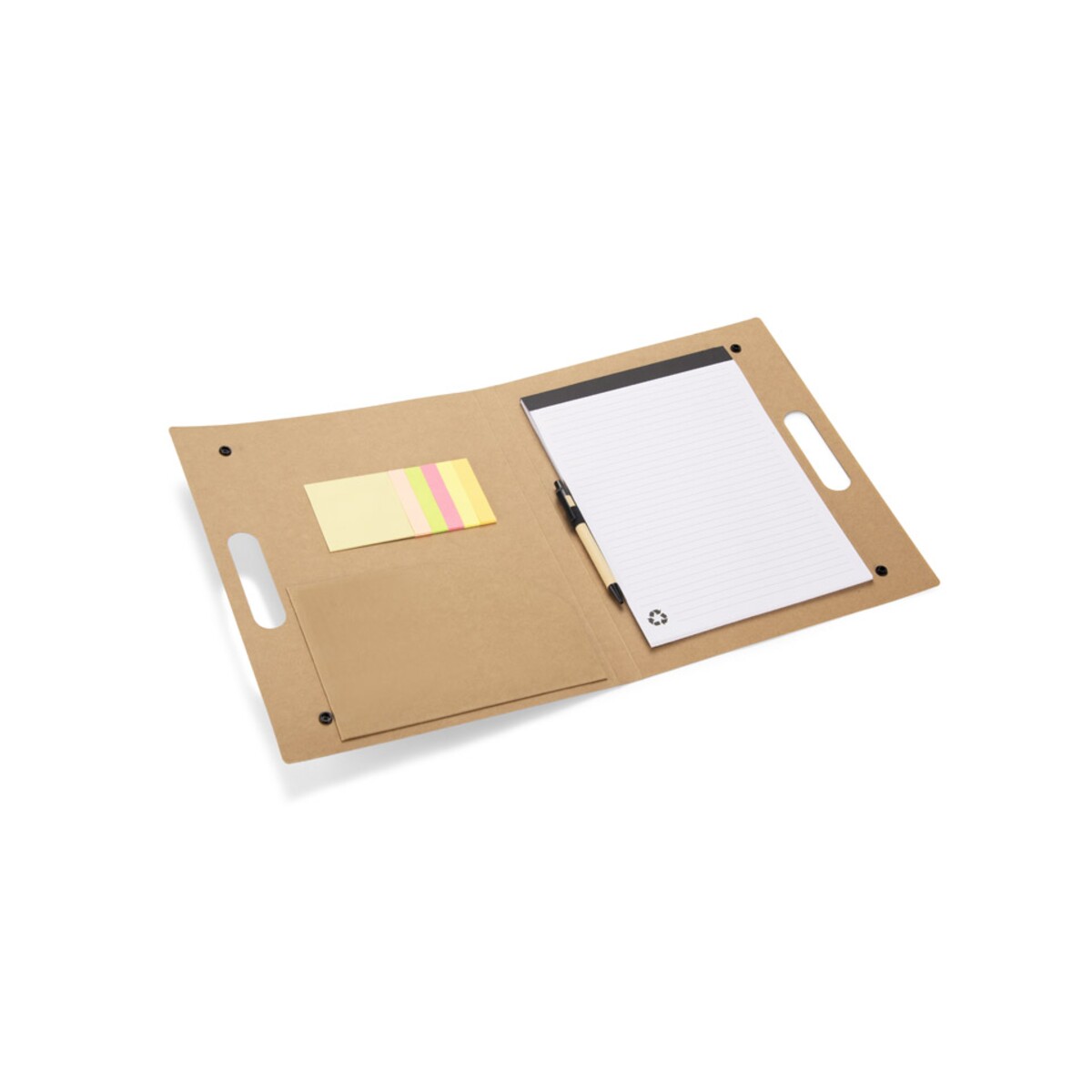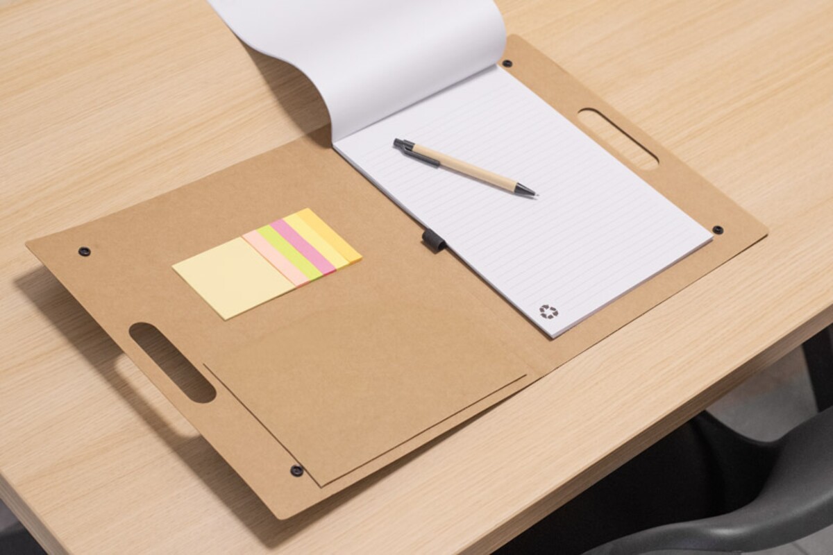 Teczka konferencyjna BOTE A4 to niezrównany gadżet biurowy, który zamienia każde spotkanie w pokaz profesjonalizmu. Wykonana z naturalnego papieru o wymiarach 280 × 345 × 8 mm i wadze zaledwie 398 g, jest lekka, a jednocześnie wytrzymała. Zamknięcie na napy oraz wbudowany uchwyt sprawiają, że dokumenty są bezpieczne i łatwe w transporcie, co stanowi doskonałą alternatywę dla ciężkich, plastikowych rozwiązań. W zestawie znajdziesz papierowy długopis, brulion A4, kieszeń na luźne kartki oraz komplet samoprzylepnych notatek – wszystko, czego potrzebujesz, aby prowadzić klarowne notatki podczas konferencji 🙂