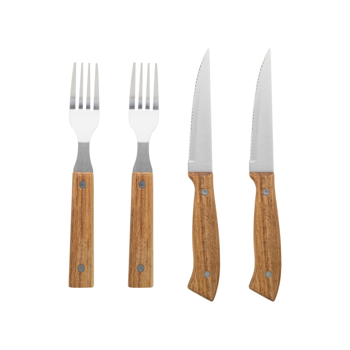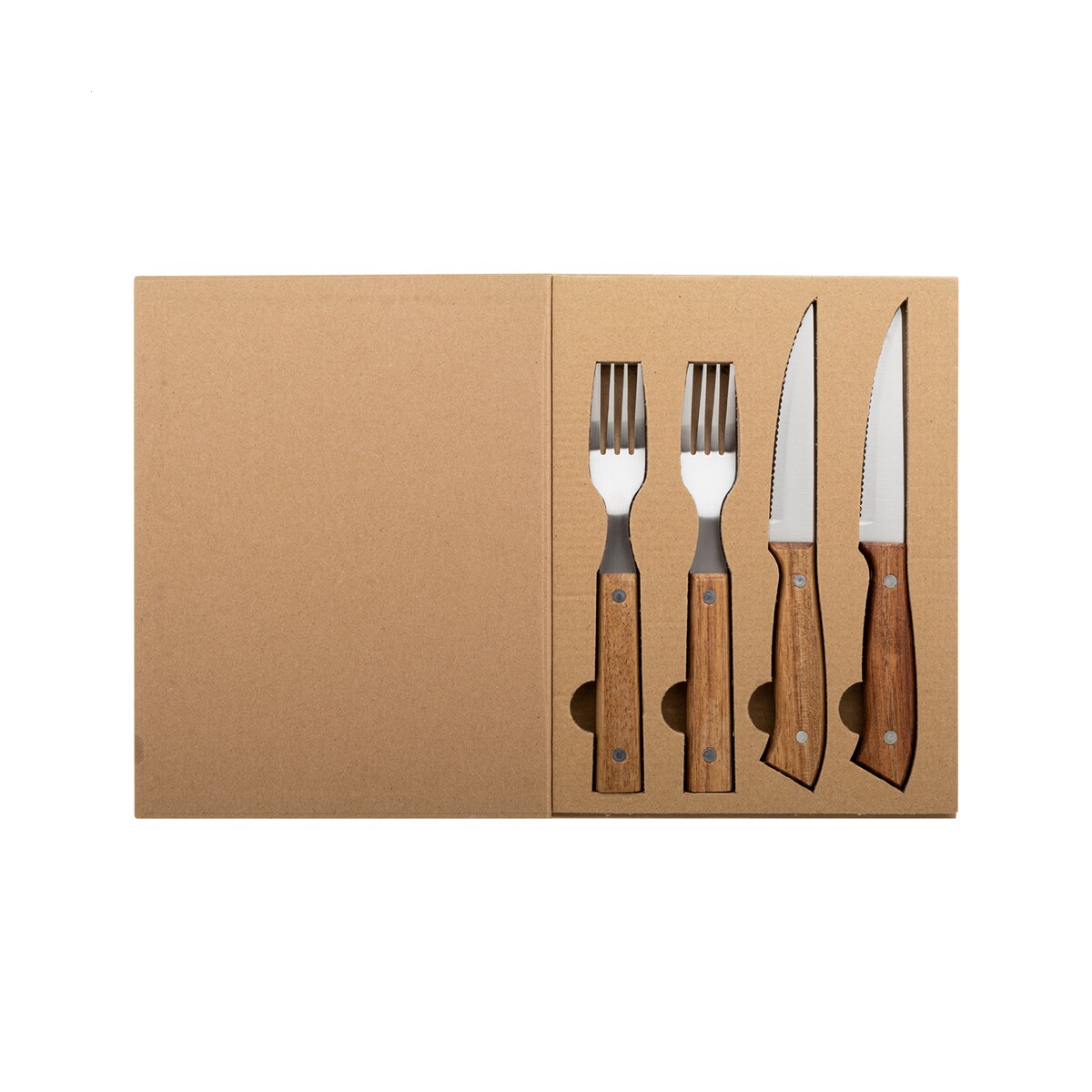 Tomahawk zestaw sztućców do steków to wyróżniający się gadżet, który podniesie rangę każdego firmowego spotkania przy grillu czy eleganckiej kolacji 😊. W skład kompletu wchodzą 2 noże do steków oraz 2 widelce wykonane z wysokogatunkowej stali nierdzewnej, wzbogaconej o rączki z drewna akacjowego, co nadaje im prestiżowy charakter oraz zapewnia wygodę trzymania. Całość zapakowano w atrakcyjne pudełko w kształcie książki z papieru kraft (wymiary 196×258×25 mm, waga 480 g), dzięki czemu produkt od razu gotowy jest na elegancki prezent. Naturalny kolor drewna doskonale współgra z możliwością naniesienia logo – dyskretny nadruk lub grawer uczyni komplet wyjątkowym, a zarazem praktycznym nośnikiem przekazu reklamowego.
