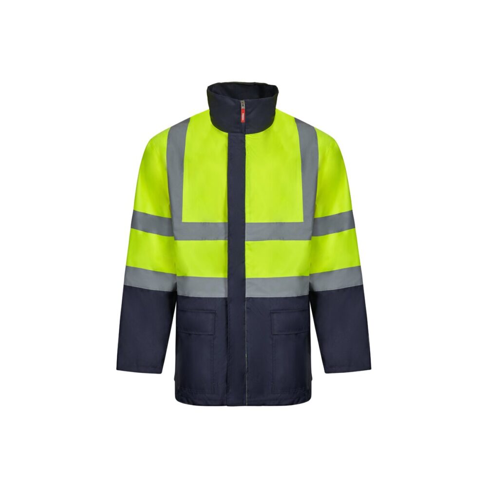 Widoczność po zmroku gwarantują szerokie elementy odblaskowe umieszczone na tułowiu, rękawach i barkach. Kurtka spełnia normę EN20471 klasa 2 oraz wymagania rozporządzenia UE 2016/425, dlatego świetnie sprawdzi się jako kurtka reklamowa z logo dla firm stawiających na bezpieczeństwo pracowników. Trzy pojemne kieszenie – dwie zewnętrzne i jedna wewnętrzna – ułatwiają przechowywanie telefonu, dokumentów czy rękawic.