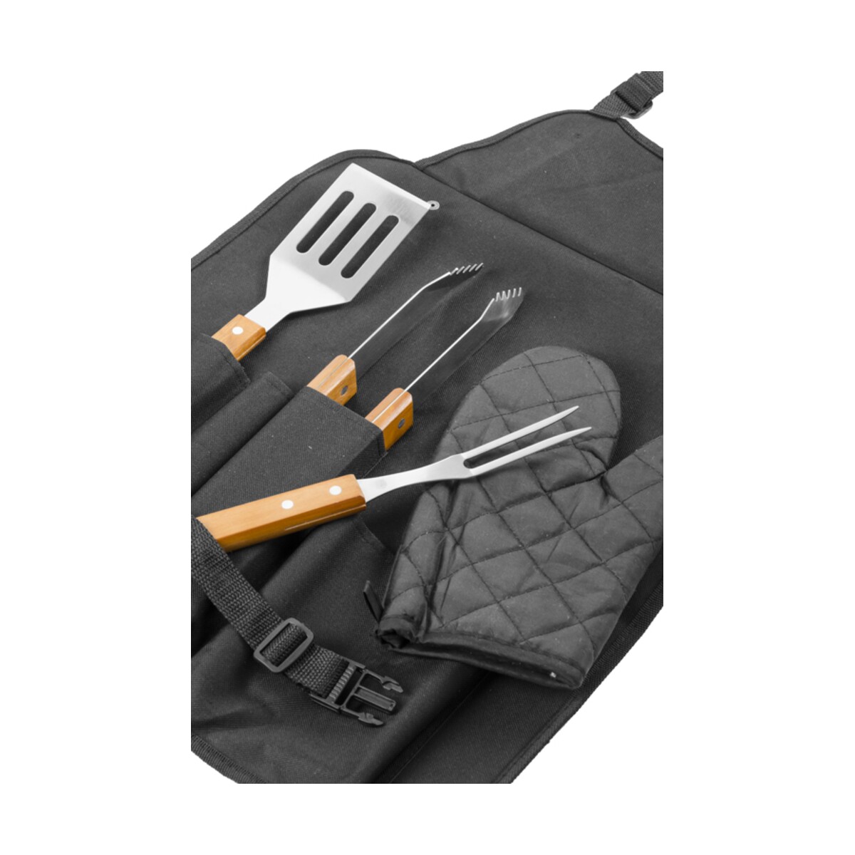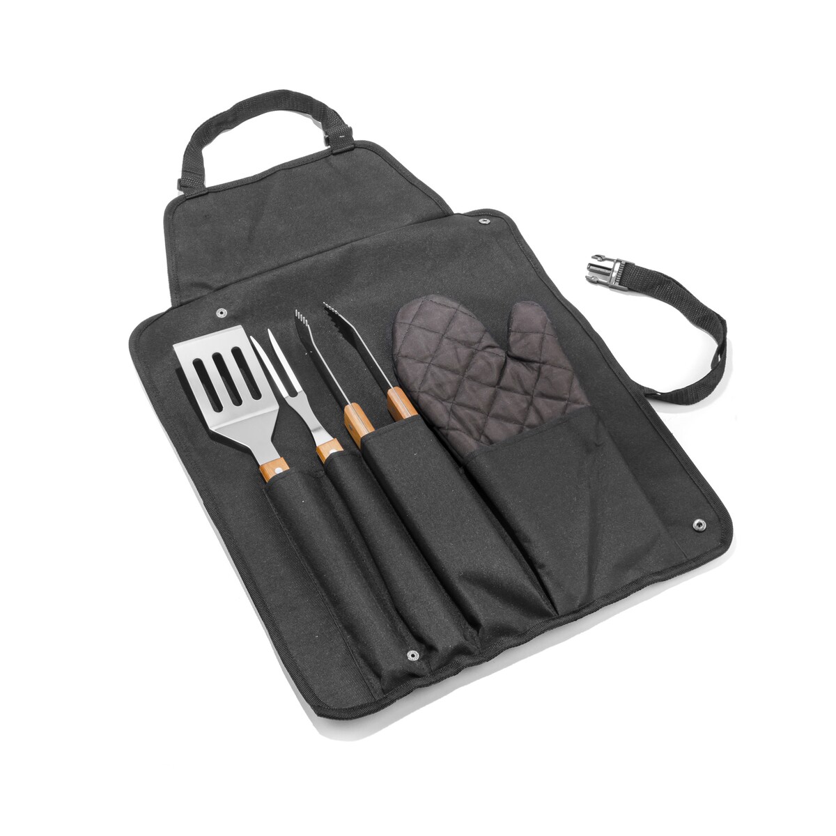 Zestaw do grilla NANDO to prawdziwie reklamowe odkrycie, które błyskawicznie podbije serca miłośników kulinarnych spotkań pod chmurką. W komplecie znajdują się najważniejsze akcesoria: szczypce, widelec i łopatka, a także solidny fartuch oraz rękawica chroniąca przed oparzeniami. Całość po złożeniu tworzy praktyczne etui, dzięki czemu ten funkcjonalny gadżet zabierzesz wszędzie – od ogrodowego party po firmowy piknik. Z wymiarami 485 × 125 × 55 mm (złożone) i wagą zaledwie 751 g jest lekki, a jednocześnie wytrzymały. Materiały takie jak nylon, metal i drewno gwarantują trwałość oraz estetykę, a elegancki czarny kolor dodaje mu klasy 😊.