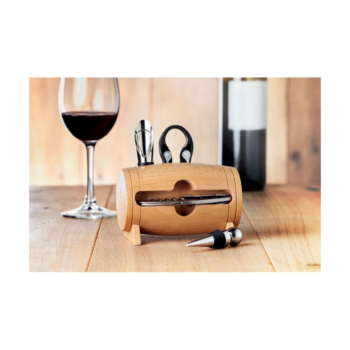 Zestaw do wina BOTA to znakomity wybór dla miłośników enologii, którzy cenią elegancję i funkcjonalność. Ten wyśmienity gadżet doskonale sprawdzi się jako prezent biznesowy, gdyż jego drewniana oprawa podkreśla prestiż i klasę marki. Na froncie stojaka przewidziano miejsce na logo, a precyzyjny nadruk laserowy zamieni go w wyjątkowy upominek reklamowy 🙂. Dzięki temu gadżet stanie się nie tylko praktycznym pomocnikiem podczas degustacji, lecz także subtelnym nośnikiem wizerunku dla Twojej firmy.