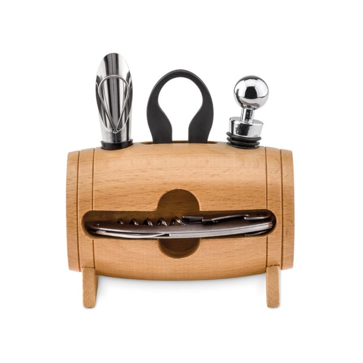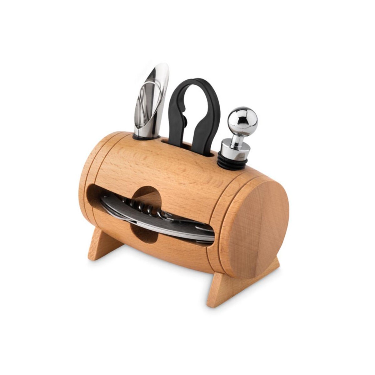W skład kompletu wchodzi nóż kelnerski, korek do wina, nalewak z korkiem oraz nóż do folii, wszystkie solidnie osadzone w stylowym stelażu z naturalnego drewna. Wymiary: 13×8×14 cm pozwalają na wygodne ustawienie zestawu na barze, w kuchni czy biurowej strefie relaksu, a waga: 0,481 kg gwarantuje stabilność podczas użytkowania. Trwały materiał: drewno oraz ponadczasowy kolor: drewniany harmonijnie łączą się z każdym wystrojem, podkreślając naturalny charakter trunku.