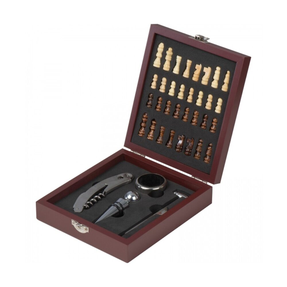 Zestaw do wina z szachami ERNST to prawdziwa perełka w świecie eleganckich upominków 🍷. W kompaktowym, brązowym pudełku z drewna ukryto zarówno komplet akcesoriów sommeliera, jak i pełen zestaw drewnianych figur szachowych, dzięki czemu połączenie relaksu przy lampce wina z intelektualną rozgrywką staje się wyjątkowo wygodne. W środku czekają: otwieracz typu nóż kelnerski, korek do butelki, termometr oraz ociekacz – wszystko wykonane z wytrzymałej stali nierdzewnej i metalu, co gwarantuje długie lata użytkowania. Całość waży jedynie 0,547 kg, a dzięki wymiarom 15 × 17,5 × 4,7 cm bez trudu zmieści się w hotelowym barku czy biurowej szufladzie.