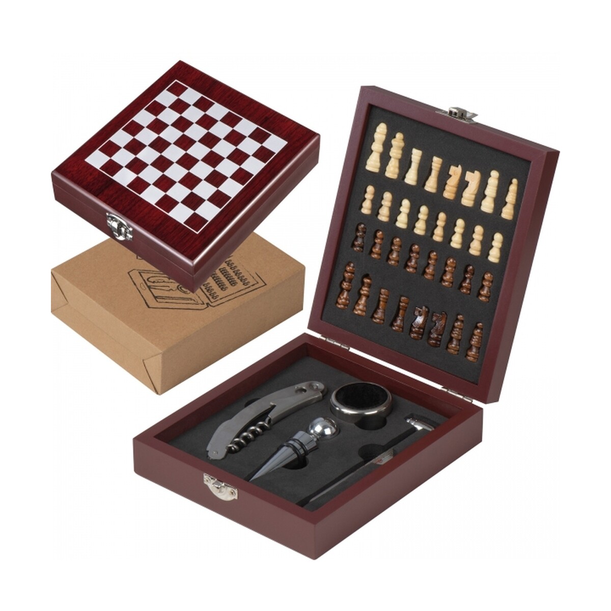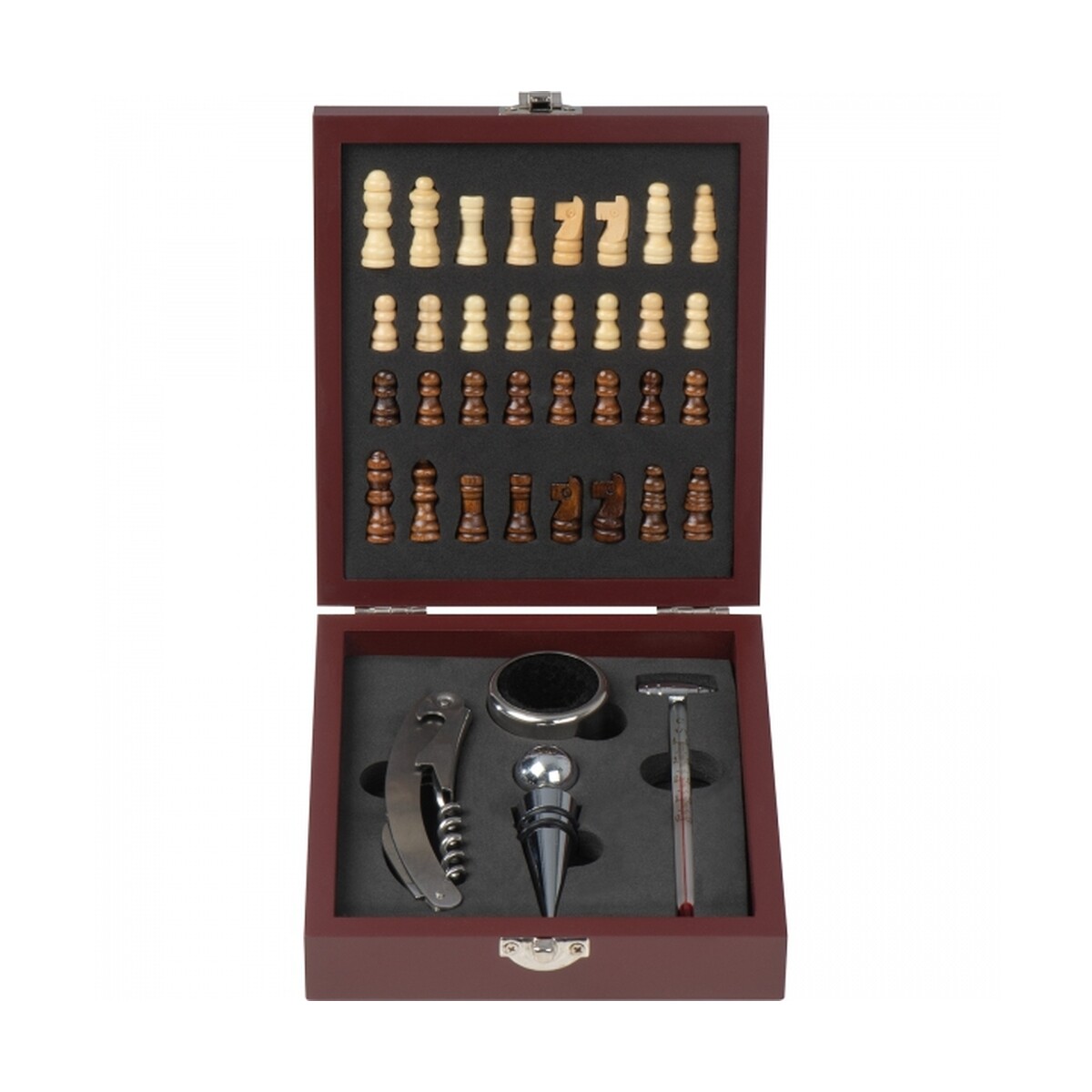 Zestaw do wina z szachami ERNST to prawdziwa perełka w świecie eleganckich upominków 🍷. W kompaktowym, brązowym pudełku z drewna ukryto zarówno komplet akcesoriów sommeliera, jak i pełen zestaw drewnianych figur szachowych, dzięki czemu połączenie relaksu przy lampce wina z intelektualną rozgrywką staje się wyjątkowo wygodne. W środku czekają: otwieracz typu nóż kelnerski, korek do butelki, termometr oraz ociekacz – wszystko wykonane z wytrzymałej stali nierdzewnej i metalu, co gwarantuje długie lata użytkowania. Całość waży jedynie 0,547 kg, a dzięki wymiarom 15 × 17,5 × 4,7 cm bez trudu zmieści się w hotelowym barku czy biurowej szufladzie.