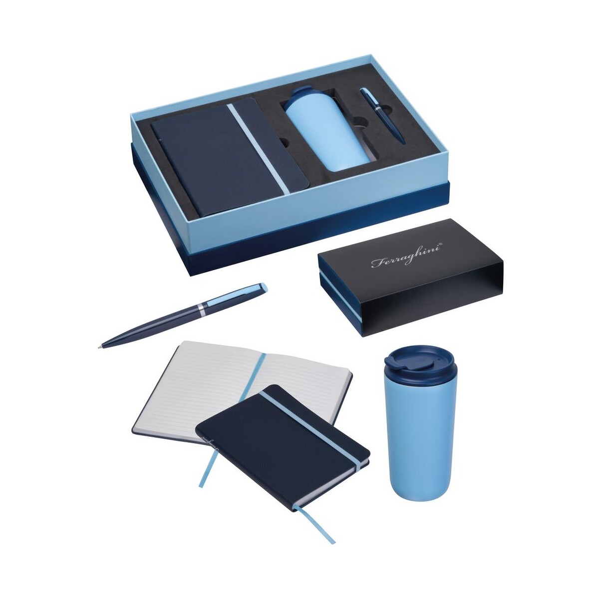 Zestaw notatnik A5, długopis i kubek Ferraghini KAMILA to wyrafinowany gadżet stworzony z myślą o prestiżowej identyfikacji marki. W eleganckim pudełku znajdziesz notes w formacie A5 z aż 192 stronami papieru z recyklingu o gramaturze 100 g/m², wykończony okładką z trwałego PU oraz materiałową zakładką. Obok niego czeka długopis z lekkiego aluminium z płynnym mechanizmem obrotowym i kubek termiczny ze stali nierdzewnej o pojemności 500 ml, zabezpieczony silikonową uszczelką. Całość w szlachetnym, niebieskim kolorze prezentuje się nowocześnie i przyciąga wzrok 🙂.