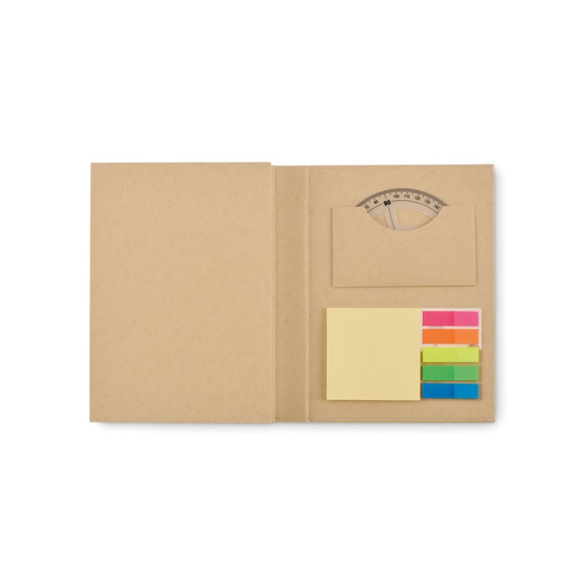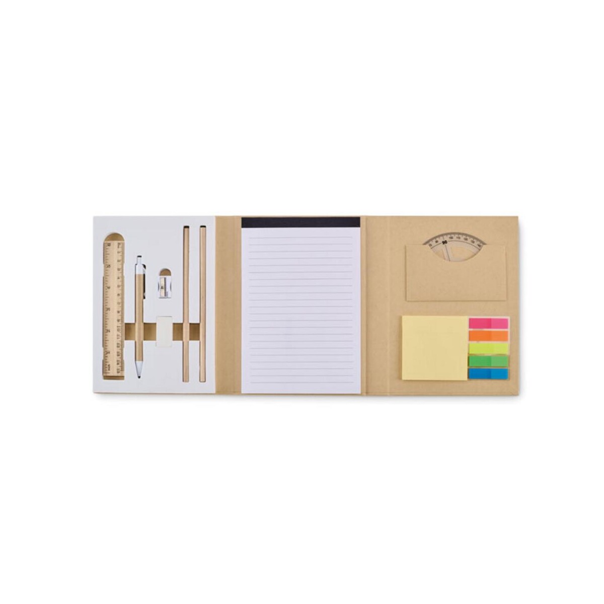 Zestaw piśmienniczy z notesem CENOTE to ekologiczny, a zarazem niezwykle praktyczny gadżet 😊, który pozwoli Ci wyróżnić się w świecie biznesu. Okładka wykonana z kartonu pochodzącego z recyklingu skrywa 70 kartek w linie, komplet karteczek samoprzylepnych i znaczników oraz cały pakiet akcesoriów: długopis z papierowym korpusem, temperówkę z ABS, 2 drewniane ołówki, drewnianą linijkę 15 cm, gumkę i kątomierz z PP. Całość waży zaledwie 0,340 kg i mieści się w kompaktowym formacie 15 × 21 × 2,5 cm, co czyni zestaw doskonałym towarzyszem w podróży służbowej, na uczelni czy podczas kreatywnych warsztatów.