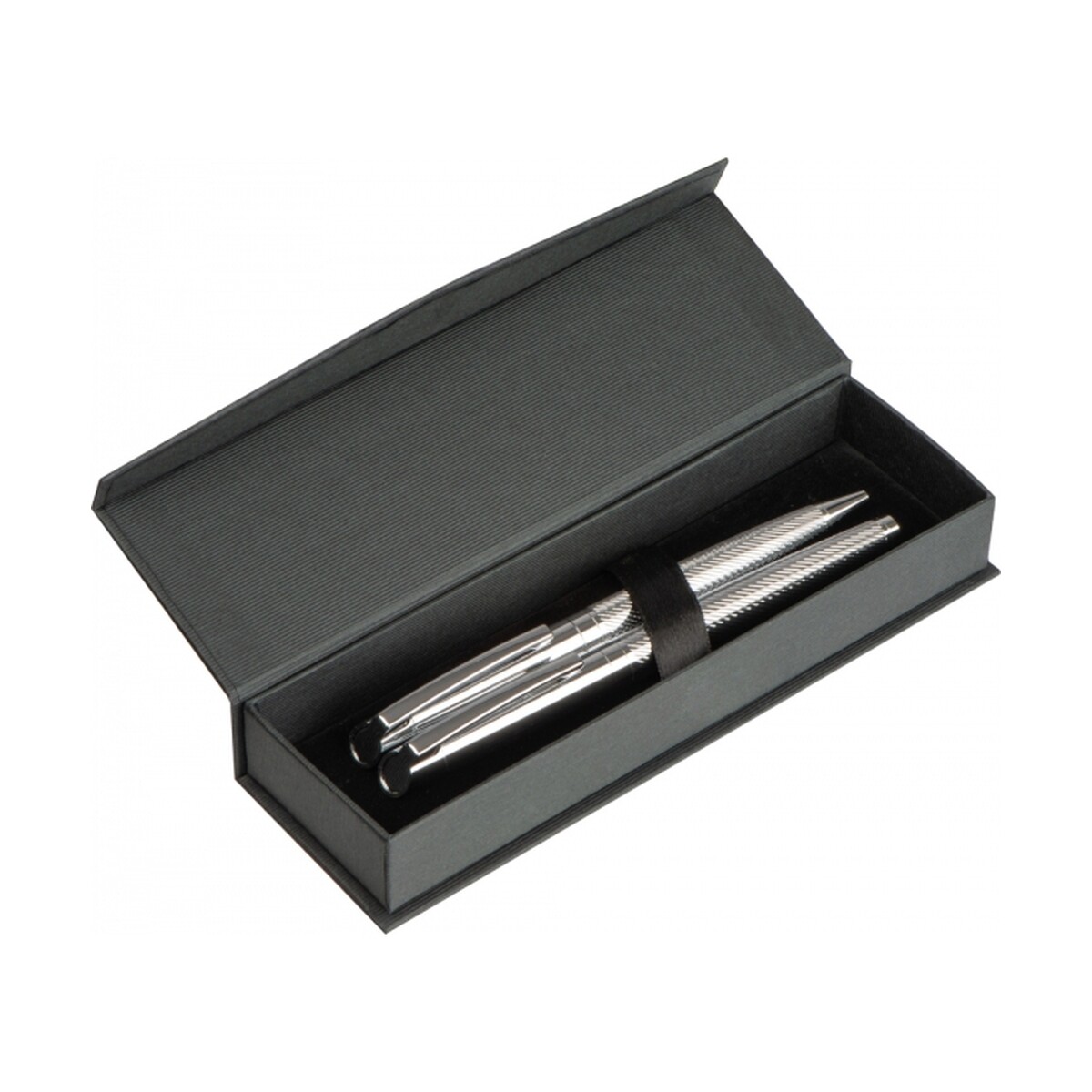 Zestaw piśmienny długopis i pióro kulkowe BERNARD to prawdziwie ekskluzywny gadżet, który podniesie prestiż każdej kampanii reklamowej. Wykonany z błyszczącego, chromowanego metalu o eleganckim, szarym wykończeniu, prezentuje się niezwykle szykownie i przyciąga uwagę już od pierwszego spojrzenia 😍. Solidna obudowa o wymiarach 17,5 × 5,5 × 2,6 cm i wadze 140 g zapewnia trwałość, a niebieski wkład gwarantuje płynność pisania. Dzięki swojej klasie zestaw stanowi doskonały nośnik logo oraz wyraźnego nadruku, który utrzyma się na powierzchni przez lata.