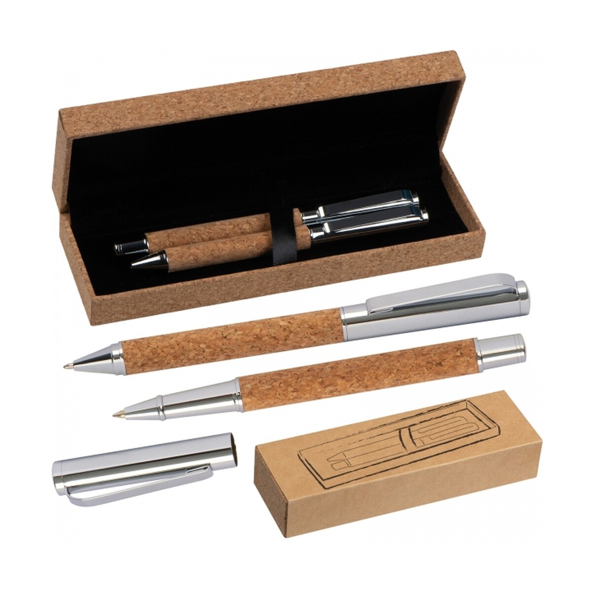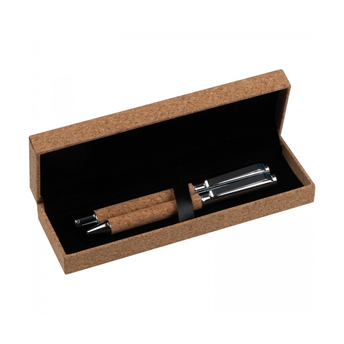 Zestaw piśmienny długopis i pióro kulkowe TEOFIL to znakomity duet, który łączy elegancję metalu z naturalnym urokiem korka. Już sam dotyk ciepłego, ekologicznego korpusu sprawia, że codzienne notowanie nabiera prestiżu 😊. Oba przybory – przekręcany długopis z wkładem o dużej pojemności oraz pióro kulkowe – mieszkają w dopasowanym, korkowym etui, które podkreśla wysmakowany styl zestawu i chroni go w podróży.