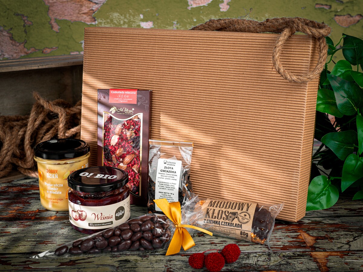 Zestaw prezentowy Zmysłowe Smaki to wykwintna propozycja, która rozbudza zmysły i tworzy niezapomniane emocje już od pierwszego spojrzenia 😀. W eleganckim opakowaniu w kolorze beżowy skrywa się bogactwo luksusowych smaków: mleczna czekolada z malinami, rodzynkami i migdałami (85 g), konfitura wiśniowa (295 g), miód z pomarańczą i imbirem (375 g), aromatyzowana herbata Złota Gwiazdka (50 g), batonik miodowy Kłos w ciemnej czekoladzie (80 g) oraz bakalie w czekoladzie deserowej (80 g). Całość uzupełnia ozdobna rafia i wypełnienie, dzięki czemu prezent jest gotowy do wręczenia w każdej chwili. Wymiary kompletu to 37 × 25,5 × 9 cm, co gwarantuje wygodę przechowywania i efektowną ekspozycję. Materiał opakowania określony został jako inny, co pozwala na swobodne dostosowanie wybranych technik zdobienia.
